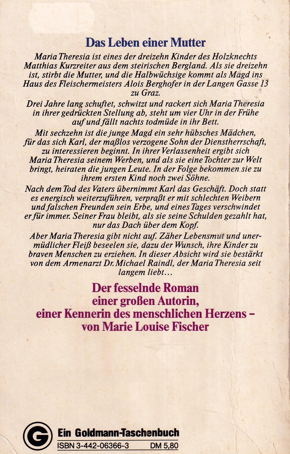 Maria Theresia ist eines der dreizehn Kinder des Holzknechts Matthias Kurzreiter aus dem steirischen Bergland. Als sie dreizehn ist, stirbt die Mutter, und die Halbwüchsige kommt als Magd ins Haus des Fleischermeisters Alois Berghofer in der Langen Gasse 13 zu Graz.