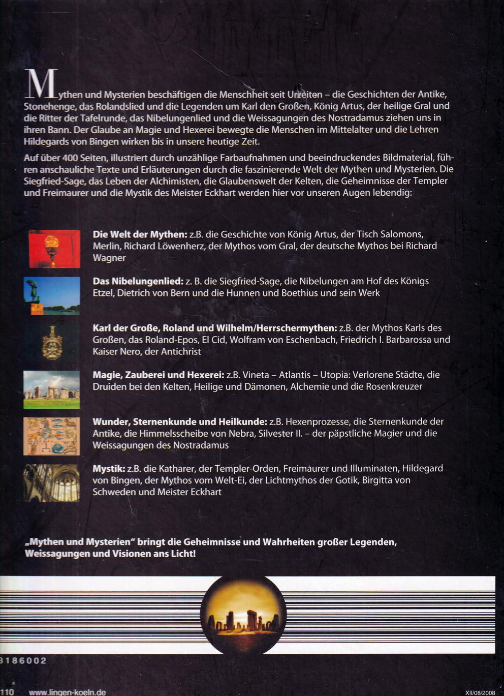 Auf über 400 Seiten, illustriert durch unzählige Farbaufnahmen und beeindruckendes Bildmaterial, führen anschauliche Texte und Erläuterungen durch die faszinierende Welt der Mythen und Mysterien. Die Siegfried-Sage, das Leben der Alchimisten, die Glaubenswelt der Kelten, die Geheimnisse der Templer und Freimaurer und die Mystik des Meister Eckhart werden hier vor unseren Augen lebendig: