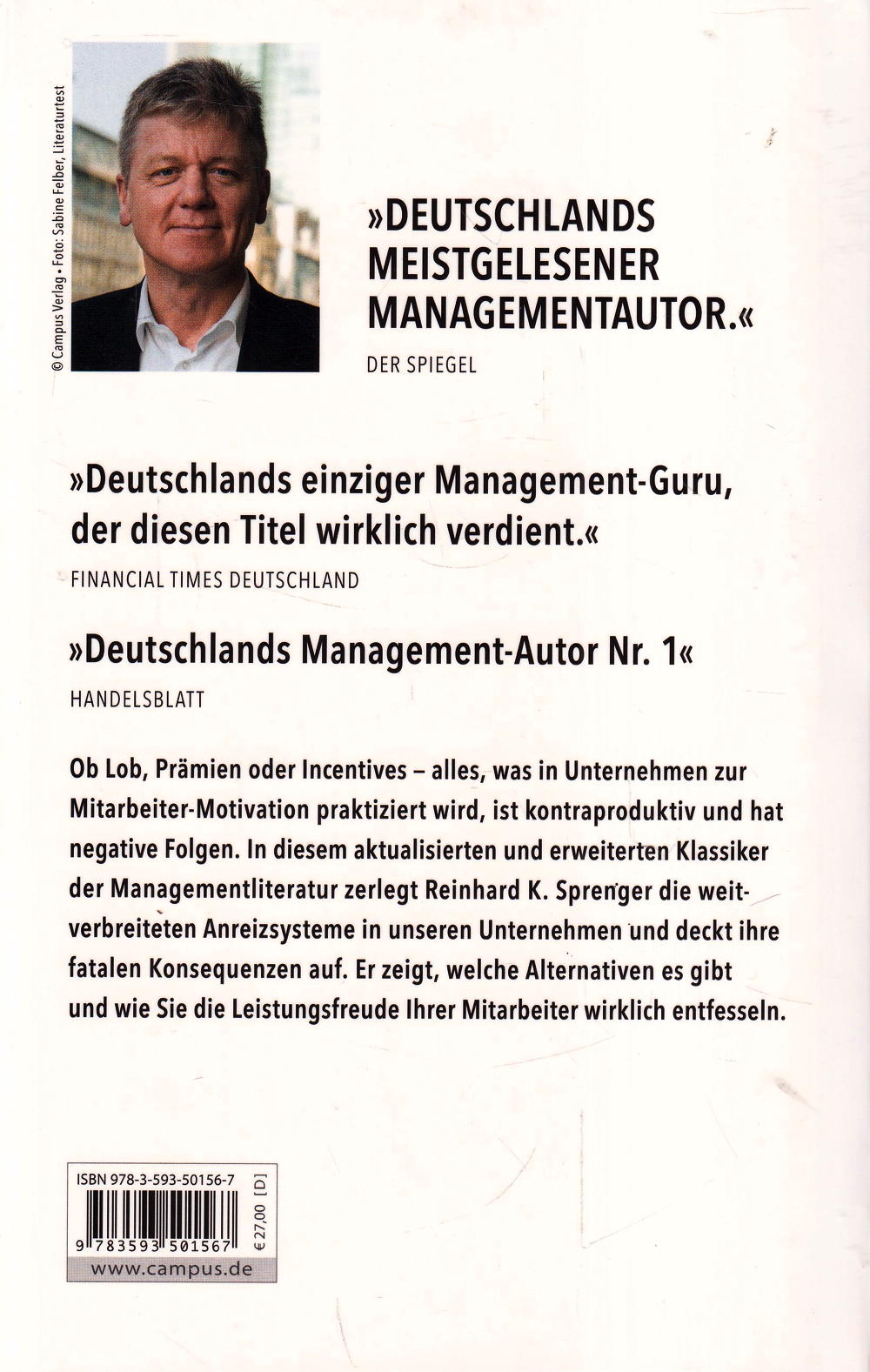 Reinhard K. Sprenger erläutert in seinem Buch: Das Vertrauen in die Eigenverantwortung und Leistungsbereitschaft der Mitarbeiter ist wesentlich effektiver als herkömmliche Motivierungskonzepte. Er stellt konkrete Alternativen vor und zeigt, wie man Rahmenbedingungen für individuelle Spielräume und mehr Selbstbestimmung schafft, Leistungsfreude entfesselt und dadurch gute Mitarbeiter hält.