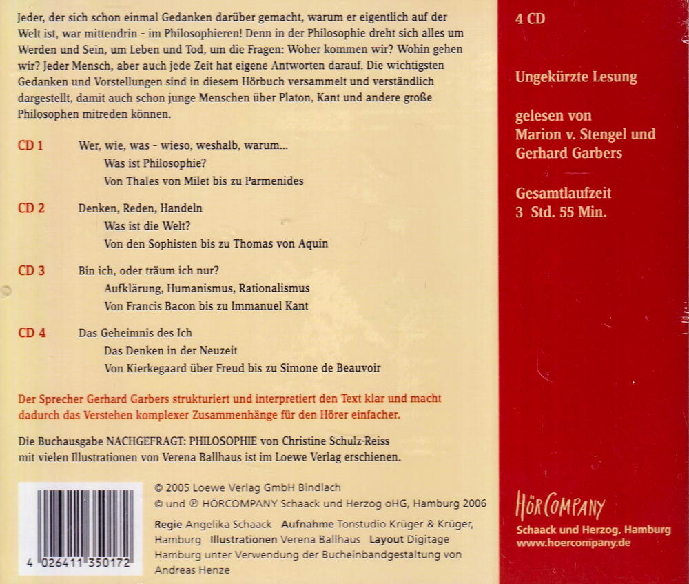 Jeder, der sich schon einmal Gedanken darüber gemacht, warum er eigentlich auf der Welt ist, war mittendrin - im Philosophieren! Denn in der Philosophie dreht sich alles um Werden und Sein, um Leben und Tod, um die Fragen: Woher kommen wir? Wohin gehen wir? Jeder Mensch, aber auch jede Zeit hat eigene Antworten darauf. Die wichtigsten Gedanken und Vorstellungen sind in diesem Hörbuch versammelt und verständlich dargestellt, damit auch schon junge Menschen über Platon, Kant und andere grosse Philosophen mitreden können.