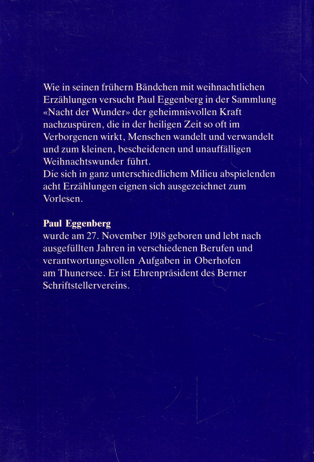 Wie in seinen frühern Bändchen mit weihnachtlichen Erzählungen versucht Paul Eggenberg in der Sammlung «Nacht der Wunder» der geheimnisvollen Kraft nachzuspüren, die in der heiligen Zeit so oft im Verborgenen wirkt, Menschen wandelt und verwandelt und zum kleinen, bescheidenen und unauffälligen Weihnachtswunder führt.