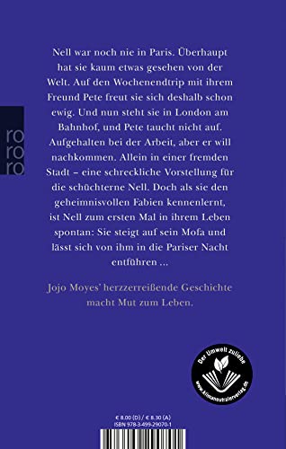 Ein hinreissender romantischer Kurzroman über ein Wochenende in Paris, das alles verändert. Berührend erzählt von Jojo Moyes, der Autorin des Bestsellers «Ein ganzes halbes Jahr». Nell war noch nie in Paris. Überhaupt hat sie noch kaum etwas gesehen von der Welt. Auf den Wochenendtrip mit ihrem Freund Pete freut sie sich deshalb schon ewig. Und nun steht sie in London am Bahnhof und Pete taucht nicht auf. Aufgehalten bei der Arbeit, aber er will nachkommen. Allein in einer fremden Stadt - eine schreckliche Vorstellung für die schüchterne Nell. Doch als sie den geheimnisvollen Fabien kennenlernt, ist Nell zum ersten Mal in ihrem Leben spontan: Sie steigt auf sein Mofa und lässt sich von ihm in die Pariser Nacht entführen …