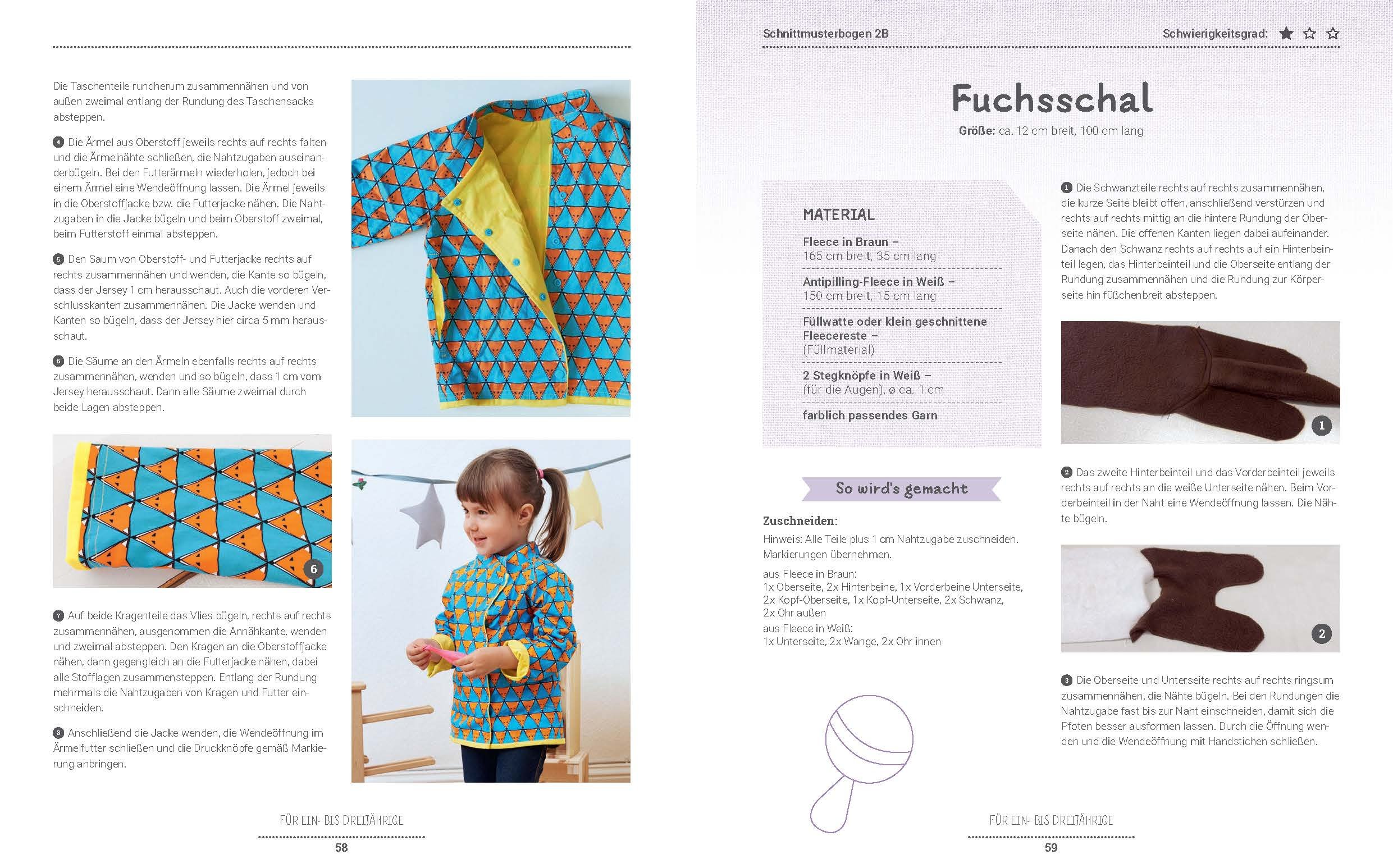 Aus weichem, dehnbarem Jersey, aus robusten Baumwollstoffen und kuschelweichem Fleece sind niedliche Hosen, ein zauberhafter Rock sowie farbenfrohe Oberteile, Overalls, Jacken, Schühchen und vieles mehr entstanden. Alle Modelle sind mit liebevollen Details gestaltet und machen garantiert jede Bewegung mit. Besonders schön: Einige der verwendeten Stoffe stammen aus Jessica Stuckstättes erster eigener Stoffkollektion, die sie exklusiv für stoffe.de entworfen hat.