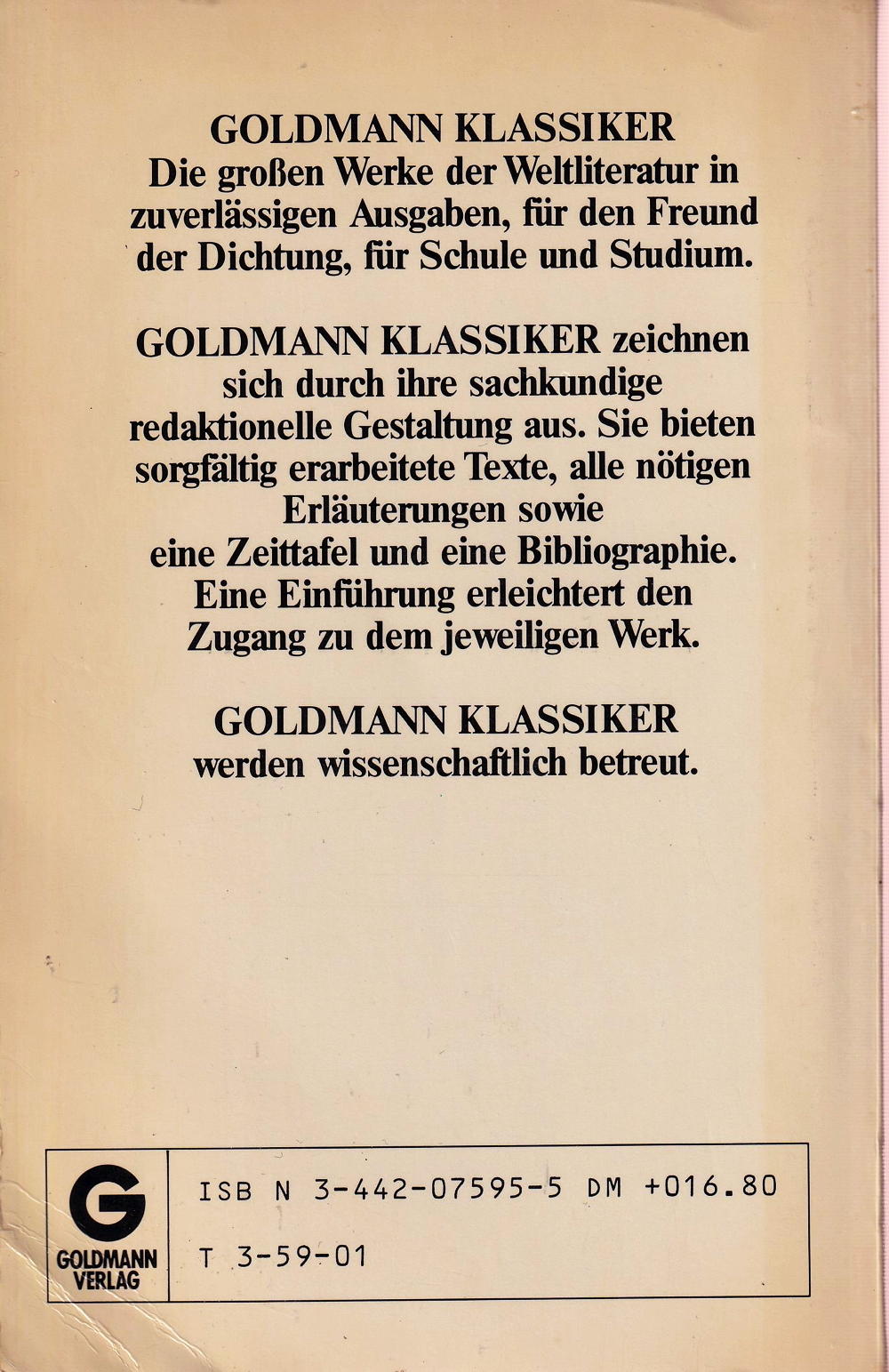 GOLDMANN KLASSIKER zeichnen sich durch ihre sachkundige redaktionelle Gestaltung aus. Sie bieten sorgfältig erarbeitete Texte, alle nötigen Erläuterungen sowie eine Zeittafel und eine Bibliographie. Eine Einführung erleichtert den Zugang zu dem jeweiligen Werk.