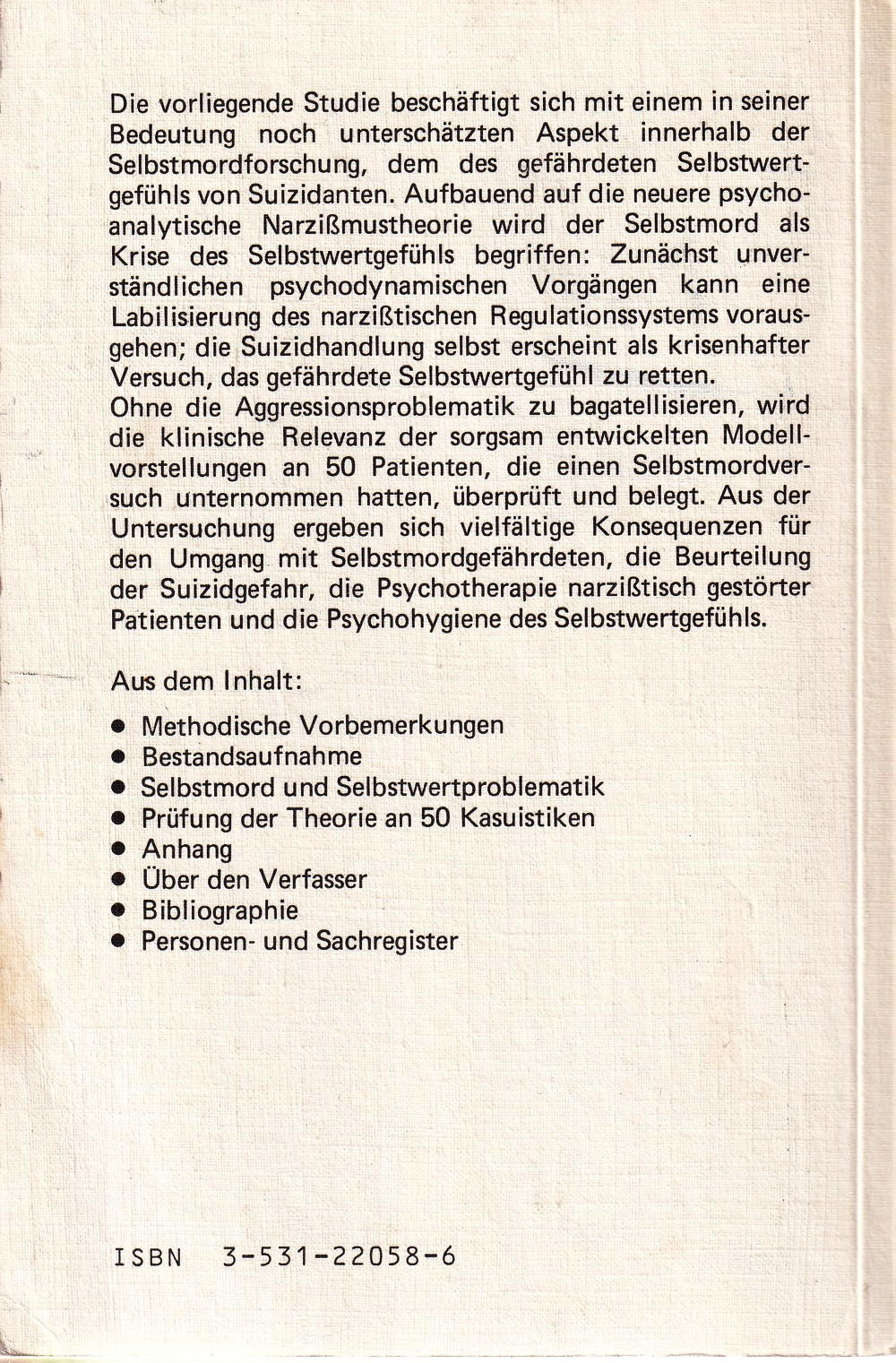 Die vorliegende Studie beschäftigt sich mit einem in seiner Bedeutung noch unterschätzten Aspekt innerhalb der Selbstmordforschung, dem des gefährdeten Selbstwertgefühls von Suizidanten. Aufbauend auf die neuere psychoanalytische Narzissmustheorie wird der Selbstmord als Krise des Selbstwertgefühls begriffen: Zunächst unverständlichen psychodynamischen Vorgängen kann eine Labilisierung des narzisstischen Regulationssystems vorausgehen; die Suizidhandlung selbst erscheint als krisenhafter Versuch, das gefährdete Selbstwertgefühl zu retten Ohne die Aggressionsproblematik zu bagatellisieren, wird die klinische Relevanz der sorgsam entwickelten Modellvorstellungen an 50 Patienten, die einen Selbstmordversuch unternommen hatten, überprüft und belegt. Aus der Untersuchung ergeben sich vielfältige Konsequenzen für den Umgang mit Selbstmordgefährdeten, die Beurteilung der Suizidgefahr, die Psychotherapie narzisstisch gestörter Patienten und die Psychohygiene des Selbstwertgefühls.