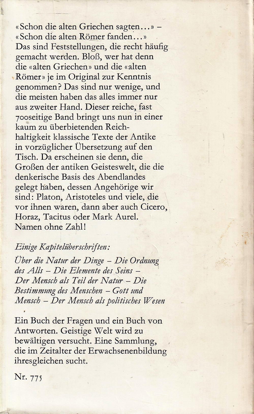 Das sind Feststellungen, die recht häufig gemacht werden. Bloss, wer hat denn die «alten Griechen » und die «alten Römer» je im Original zur Kenntnis genommen? Das sind nur wenige, und die meisten haben das alles immer nur aus zweiter Hand. Dieser reiche, fast 70 oseitige Band bringt uns nun in einer kaum zu überbietenden Reichhaltigkeit klassische Texte der Antike in vorzüglicher Übersetzung auf den Tisch. Da erscheinen sie denn, die Grossen der antiken Geisteswelt, die die denkerische Basis des Abendlandes gelegt haben, dessen Angehörige wir sind: Platon, Aristoteles und viele, die vor ihnen waren, dann aber auch Cicero, Horaz, Tacitus oder Mark Aurel.