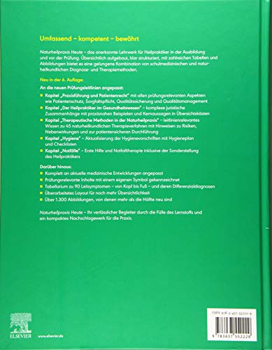 Neu in der 6. Auflage von „Naturheilpraxis heute: Kapitel 1: „Praxisführung und Patientenrecht mit allen prüfungsrelevanten Aspekten wie Patientenschutz und Sorgfaltspflicht, Qualitätssicherung, Qualitätsmanagement, Schadensersatz Kapitel 2: Der Heilpraktiker im Gesundheitswesen: komplexe juristische Zusammenhänge mit praxisnahen Beispielen und Kernaussagen in Übersichtkästen Kapitel 4: Therapeutische Methoden in der Naturheilpraxis: die 45 wichtigsten naturheilkundlichen Therapieverfahren – darüber wird der angehende Heilpraktiker ggf. auch in der Prüfung befragt Kapitel 5: Hygiene: Aktualisierung der Hygiene-Vorschriften (Hygieneplan, Checklisten, Desinfektion etc. ) Kapitel 30: Notfall: Erste Hilfe und Notfalltherapie inkl. die Sonderstellung des Heilpraktikers – nach den neuen Prüfungsleitlinien mit deutlich mehr Bedeutung.