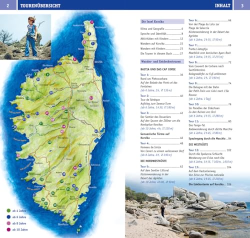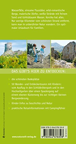Korsika mit Kindern - Wasserfälle, einsame Flusstäler, wild-romantische Berge, malerische Dörfer, weisse Strände mit feinem Sand und türkisblauem Wasser. Korsika hat alles. Nur wenige Kilometer vom schönsten Strand entfernt, kann man in unberührter Natur wandern. Ein optimaler Urlaubsort für Familien. Das Buch enthält 50 Tourenvorschläge für Familien: vom Besuch im Schildkrötenpark oder im Hochseilgarten über einfache kurze Küstenwanderungen bis zur richtigen kleinen Bergtour. Auch ein Ausflug mit dem Kanu und eine Wanderung mit Esel sind dabei. Alle Touren sind sorgfältig beschrieben und mit detaillierter Karte, Höhenprofil und vielen stimmungsvollen Fotos ergänzt. Zusätzliche Informationen über Natur, Geschichte und Kultur der Insel helfen Eltern, Kinderfragen zu beantworten oder interessante Geschichten zu erzählen. Das Buch enthält neben den Wanderungen auch die schönsten Strände und viele weitere Ausflugsziele für Familien, sowie einen detaillierten Campingführer und viele praktische Reisetipps.