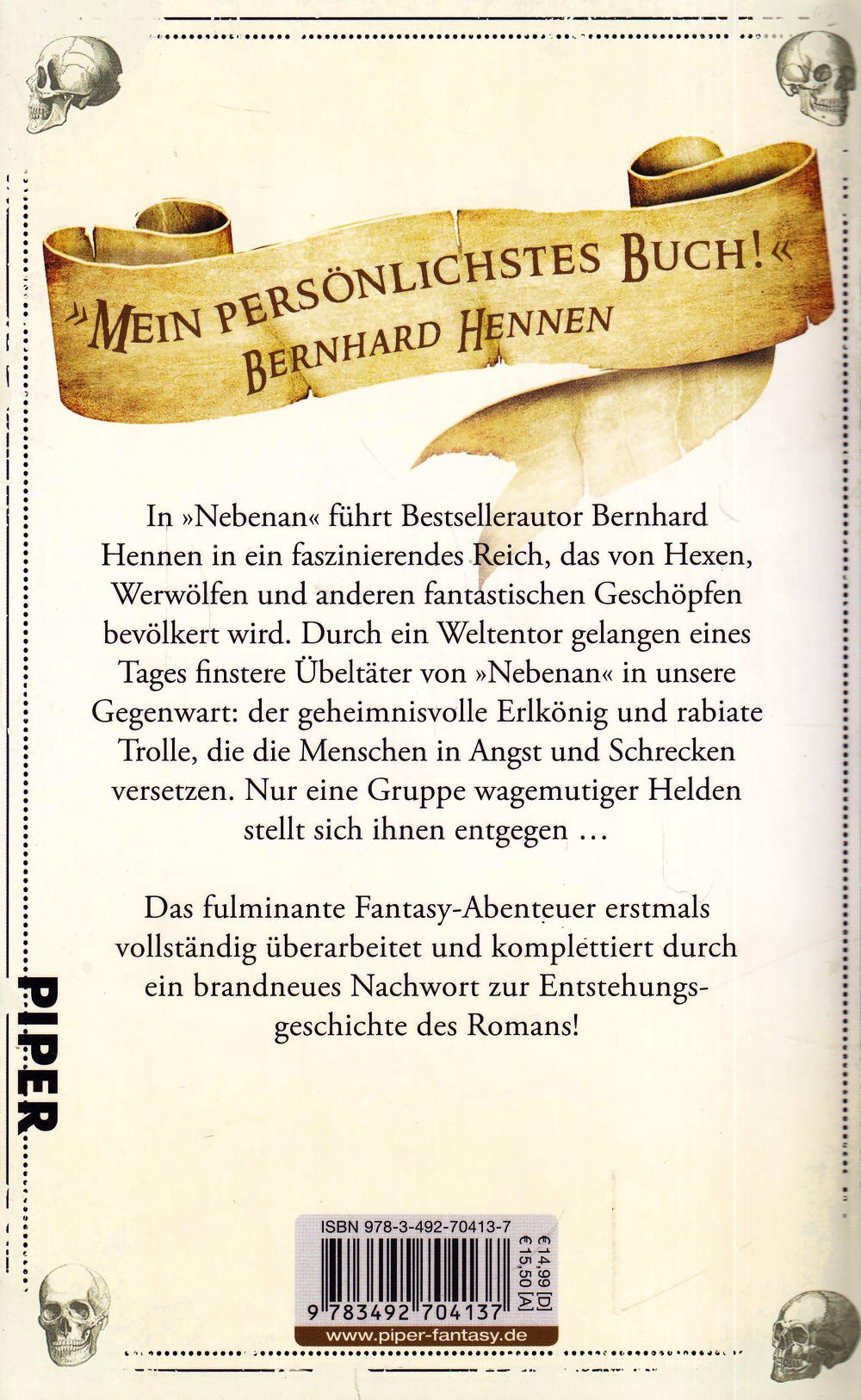 Mit seinen »Elfen«-Romanen begeisterte Bernhard Hennen unzählige Fans. In »Nebenan« führt er in ein faszinierendes Reich, das von Hexen, Werwölfen und anderen fantastischen Geschöpfen bevölkert wird: Als Altgermanistik-Student Till Küster an einer Geisterbeschwörung teilnimmt, ahnt er nicht, was er damit anrichtet. Denn die angerufenen »Dunklen« tauchen tatsächlich auf – Graf Cagliostro, der Erlkönig und ein geistig etwas minderbemittelter Werwolf aus dem Reich Nebenan wollen unsere Welt erobern. Nun ist es an Till, sie zurückzuschlagen. Unterstützt wird er von einer bezaubernden Dryade, die sich in ihn verliebt hat, und von Heinzelmännchen, die alles andere als altmodisch sind: Sie können mit Computern und Handys umgehen, und wenn es darum geht, die Welt zu retten, sind sie um einiges ausgefuchster als ihre menschlichen Verbündeten.