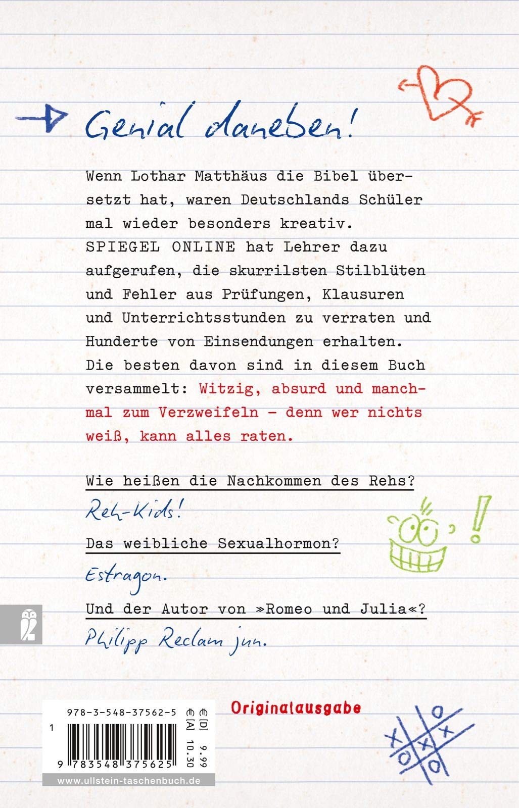 Wenn Lothar Matthäus die Bibel übersetzt hat, waren Deutschlands Schüler mal wieder besonders kreativ. SPIEGEL ONLINE hat Lehrer dazu aufgerufen, die skurrilsten Stilblüten und Fehler aus Prüfungen, Klausuren und Unterrichtsstunden zu verraten und Hunderte von Einsendungen erhalten. Die besten davon sind in diesem Buch versammelt: Ein Beispiel für eine heimische Vogelart? Das Rotkäppchen. Das weibliche Sexualhormon? Estragon. Und Deutschlands bekannte Nadelbäume? Tanne, Fichte und Oberkiefer. Witzig, absurd und manchmal zum Verzweifeln – denn wer nichts weiss, kann alles raten.Wenn Lothar Matthäus die Bibel übersetzt hat, waren Deutschlands Schüler mal wieder besonders kreativ. SPIEGEL ONLINE hat Lehrer dazu aufgerufen, die skurrilsten Stilblüten und Fehler aus Prüfungen, Klausuren und Unterrichtsstunden zu verraten und Hunderte von Einsendungen erhalten. Die besten davon sind in diesem Buch versammelt: Ein Beispiel für eine heimische Vogelart? Das Rotkäppchen. Das weibliche Sexualhormon? Estragon. Und Deutschlands bekannte Nadelbäume? Tanne, Fichte und Oberkiefer. Witzig, absurd und manchmal zum Verzweifeln - denn wer nichts weiss, kann alles raten.