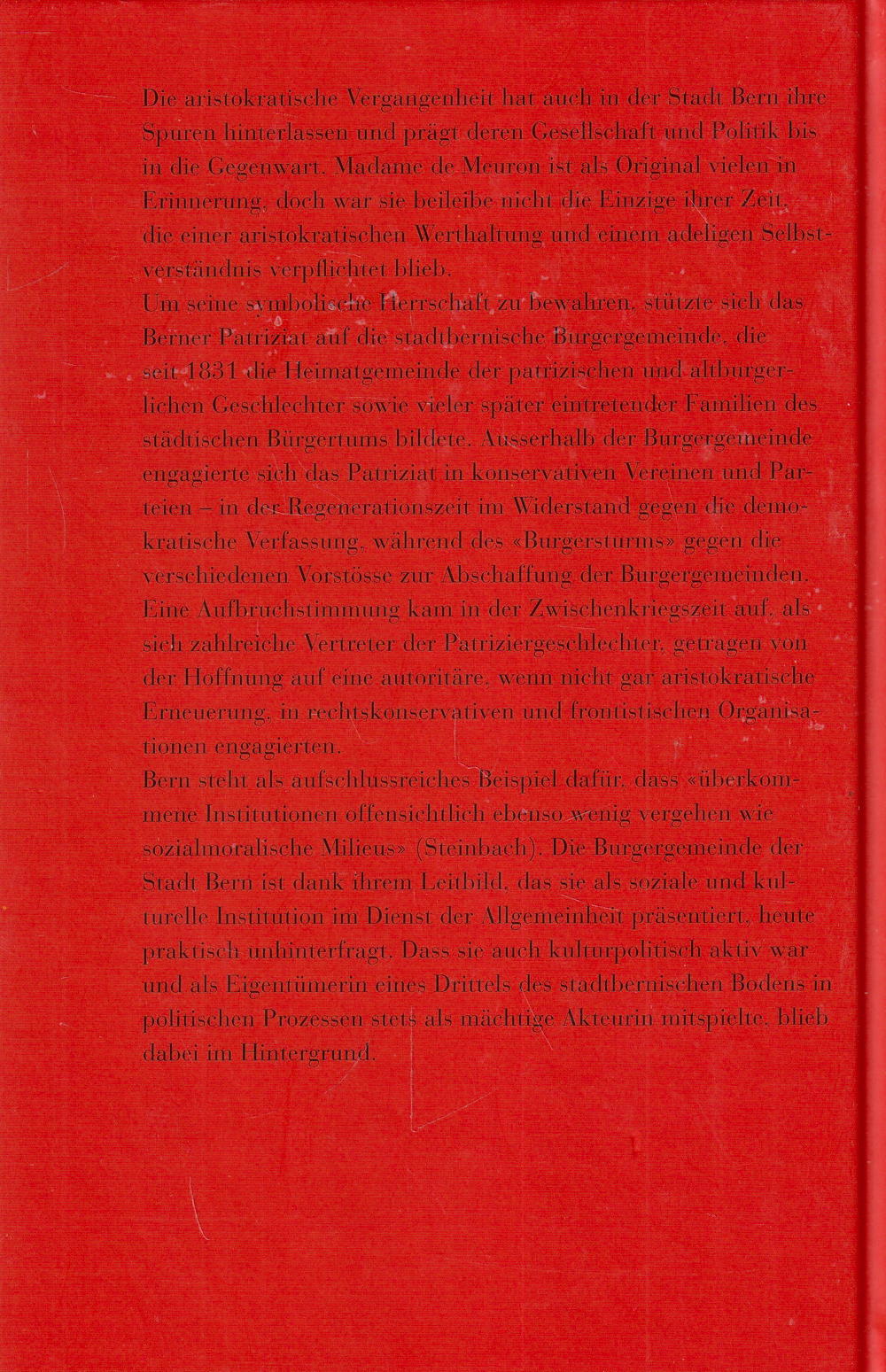 Die aristokratische Vergangenheit hat auch in Bern ihre Spuren hinterlassen und prägt die stadtbernische Gesellschaft und Politik bis in die Gegenwart. Madame de Meuron ist als Berner Original vielen in Erinnerung geblieben, doch sie war beileibe nicht die Einzige ihrer Zeit, die einer aristokratischen Werthaltung und einem adeligen Selbstverständnis verpflichtet blieb. Um seine symbolische Herrschaft zu bewahren, konnte sich das Berner Patriziat auf die stadtbernische Burgergemeinde stützen, die seit 1831 die Heimatgemeinde der patrizischen und altburgerlichen Geschlechter sowie zahlreicher später eingetretener Familien aus dem städtischen Bürgertum bildete. Ausserhalb der Burgergemeinde engagierte sich das Patriziat in konservativen Vereinen und Parteien – in der Regenerationszeit zunächst im Widerstand gegen die demokratische Verfassung, während des 'Burgersturms' gegen die verschiedenen Vorstösse zur Abschaffung der bernischen Burgergemeinden. Eine Aufbruchstimmung kam in der Zwischenkriegszeit auf, als sich zahlreiche Vertreter der Patriziergeschlechter, getragen von der Hoffnung auf eine autoritäre wenn nicht gar aristokratische Erneuerung, in rechtskonservativen und frontistischen Organisationen engagierten. Bern steht als aufschlussreiches Beispiel dafür, dass 'überkommene Institutionen offensichtlich ebenso wenig vergehen wie sozialmoralische Milieus' (Steinbach). Die Burgergemeinde der Stadt Bern – die reichste Korporation in der Schweiz und Grundeigentümerin eines Drittels des stadtbernischen Bodens – ist dank ihrem Leitbild, das sie als soziale und kulturelle Institution zugunsten der Allgemeinheit präsentiert, heute praktisch unhinterfragt. Dass sie durch ihre Beteiligung am Bernischen Historischen Museum oder durch die 'Rettung' von Altstadthäusern, mit der sie sich als 'Hüterin der bernischen Tradition' positionierte, auch kulturpolitisch aktiv war oder dass sie als private Grundeigentümerin auch bodenpolitisch wirkte und in politischen Prozessen stets als mächtige Akteurin mitspielte, blieb dabei im Hintergrund.