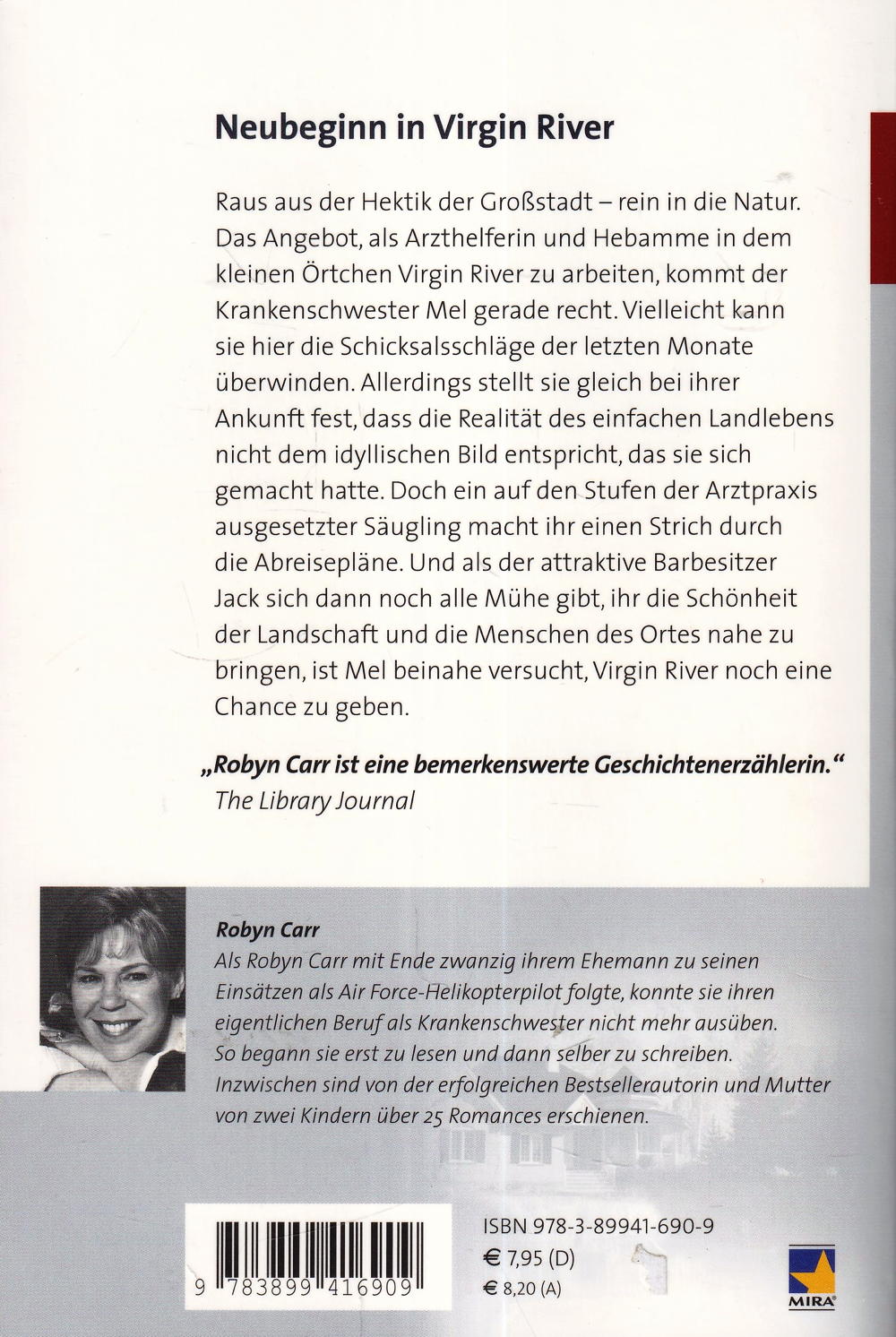 Raus aus der Hektik der Grossstadt, rein in die Natur. Das Angebot, als Arzthelferin und Hebamme in dem kleinen Örtchen Virgin River zu arbeiten, kommt der Krankenschwester Mel gerade recht. Vielleicht kann sie hier die Schicksalsschläge der letzten Monate überwinden. Allerdings stellt sie gleich bei ihrer Ankunft fest, dass die Realität des einfachen Landlebens nicht dem idyllischen Bild entspricht, was sie sich gemacht hatte. Doch ein auf den Stufen der Arztpraxis ausgesetzter Säugling macht ihr einen Strich durch die Abreisepläne. Und als der attraktive Barbesitzer Jack sich dann noch alle Mühe gibt, ihr die Schönheit der Landschaft und die Menschen des Ortes nahe zu bringen, ist Mel beinahe versucht, Virgin River noch eine Chance zu geben.