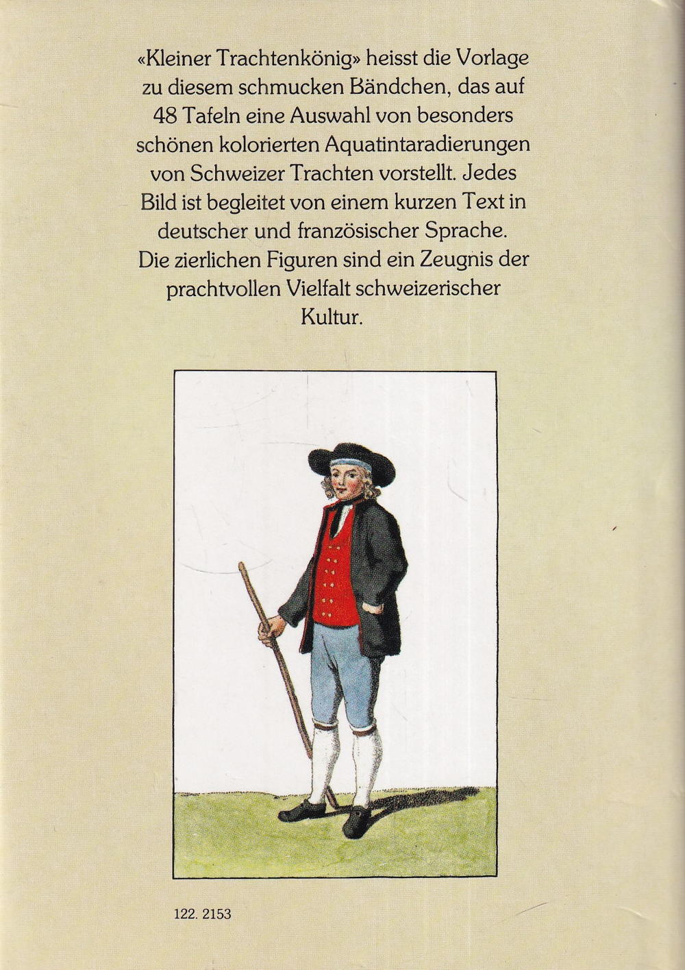 «Kleiner Trachtenkönig» heisst die Vorlage zu diesem schmucken Bändchen, das auf 48 Tafeln eine Auswahl von besonders schönen kolorierten Aquatintaradierungen von Schweizer Trachten vorstellt. Jedes Bild ist begleitet von einem kurzen Text in deutscher und französischer Sprache.