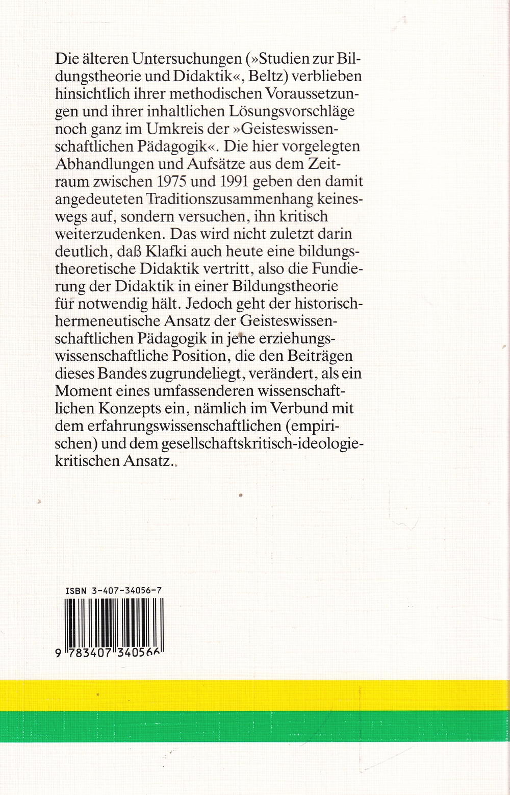 Die älteren Untersuchungen (»Studien zur Bildungstheorie und Didaktik«, Beltz) verblieben hinsichtlich ihrer methodischen Voraussetzungen und ihrer inhaltlichen Lösungsvorschläge noch ganz im Umkreis der »Geisteswissenschaftlichen Pädagogik«. Die hier vorgelegten Abhandlungen und Aufsätze aus dem Zeitraum zwischen 1975 und 1991 geben den damit angedeuteten Traditionszusammenhang keineswegs auf, sondern versuchen, ihn kritisch weiterzudenken. Das wird nicht zuletzt darin deutlich, dass Klafki auch heute eine bildungstheoretische Didaktik vertritt, also die Fundierung der Didaktik in einer Bildungstheorie für notwendig hält. Jedoch geht der historisch hermeneutische Ansatz der Geisteswissenschaftlichen Pädagogik in jene erziehungswissenschaftliche Position, die den Beiträgen dieses Bandes zugrundeliegt, verändert, als ein Moment eines umfassenderen wissenschaftlichen Konzepts ein, nämlich im Verbund mit dem erfahrungswissenschaftlichen (empirischen) und dem gesellschaftskritisch-ideologiekritischen Ansatz..