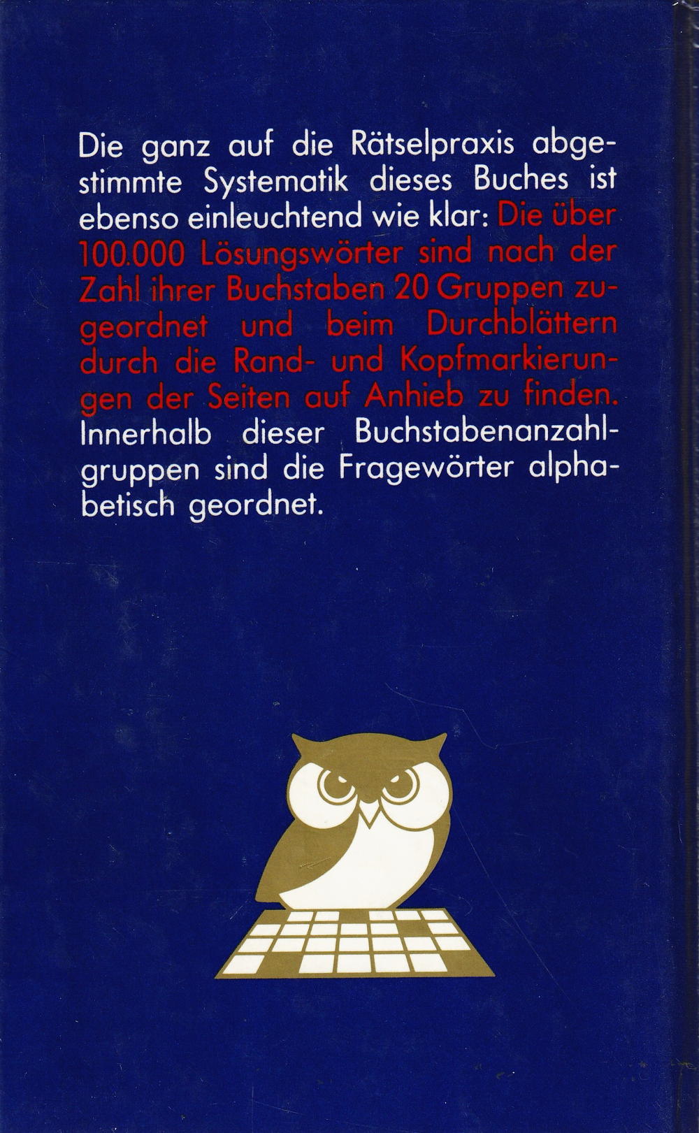 Die ganz auf die Rätselpraxis abgestimmte Systematik dieses Buches ist ebenso einleuchtend wie klar: Die über 100.000 Lösungswörter sind nach der Zahl ihrer Buchstaben 20 Gruppen zugeordnet und beim Durchblättern durch die Rand- und Kopfmarkierungen der Seiten auf Anhieb zu finden.