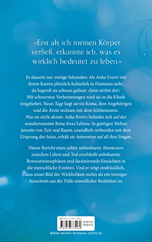 Mit schwersten Verbrennungen wird sie in die Klinik eingeliefert. Neun Tage liegt sie im Koma, ihre Angehörigen und die Ärzte rechnen mit dem Schlimmsten. Was sie nicht ahnen: Anke Evertz befindet sich auf der wundersamsten Reise ihres Lebens. In geistigen Welten, jenseits von Zeit und Raum, unendlich verbunden mit dem Ursprung des Seins, erhält sie Antworten auf all ihre Fragen. Dieser Bericht eines schier unfassbaren Abenteuers zwischen Leben und Tod erschliesst unbekannte Bewusstseinssphären und faszinierende Einsichten in die menschliche Existenz. Und er zeigt eindrücklich, dass unser Bild der Wirklichkeit nichts als ein winziger Ausschnitt aus der Fülle unendlicher Realitäten ist.