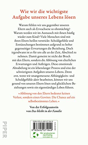 Warum fühlen wir uns gegenüber unseren Eltern auch als Erwachsene so ohnmächtig? Warum werden wir im Austausch mit ihnen häufig wieder zum Kind? Viele Menschen sind mit ihren Eltern heillos verstrickt: Schuldgefühle und Enttäuschungen bestimmen aufgrund zu hoher gegenseitiger Erwartungen die Beziehung. Doch irgendwann ist es für uns alle an der Zeit, Abschied zu nehmen. Damit gemeint ist nicht der Bruch mit den Eltern, sondern die Ablösung von elterlichen Erwartungen und Aufträgen. Diese emotionale Abnabelung ist ein lebenslanger Prozess und eine der schwierigsten Aufgaben unseres Lebens. Denn erst, wenn wir unangemessene Abhängigkeits- und Schuldgefühle aktiv bearbeiten, können wir uns gesund von unseren Eltern lösen und glücklichere Beziehungen sowie ein eigenständiges Leben führen.