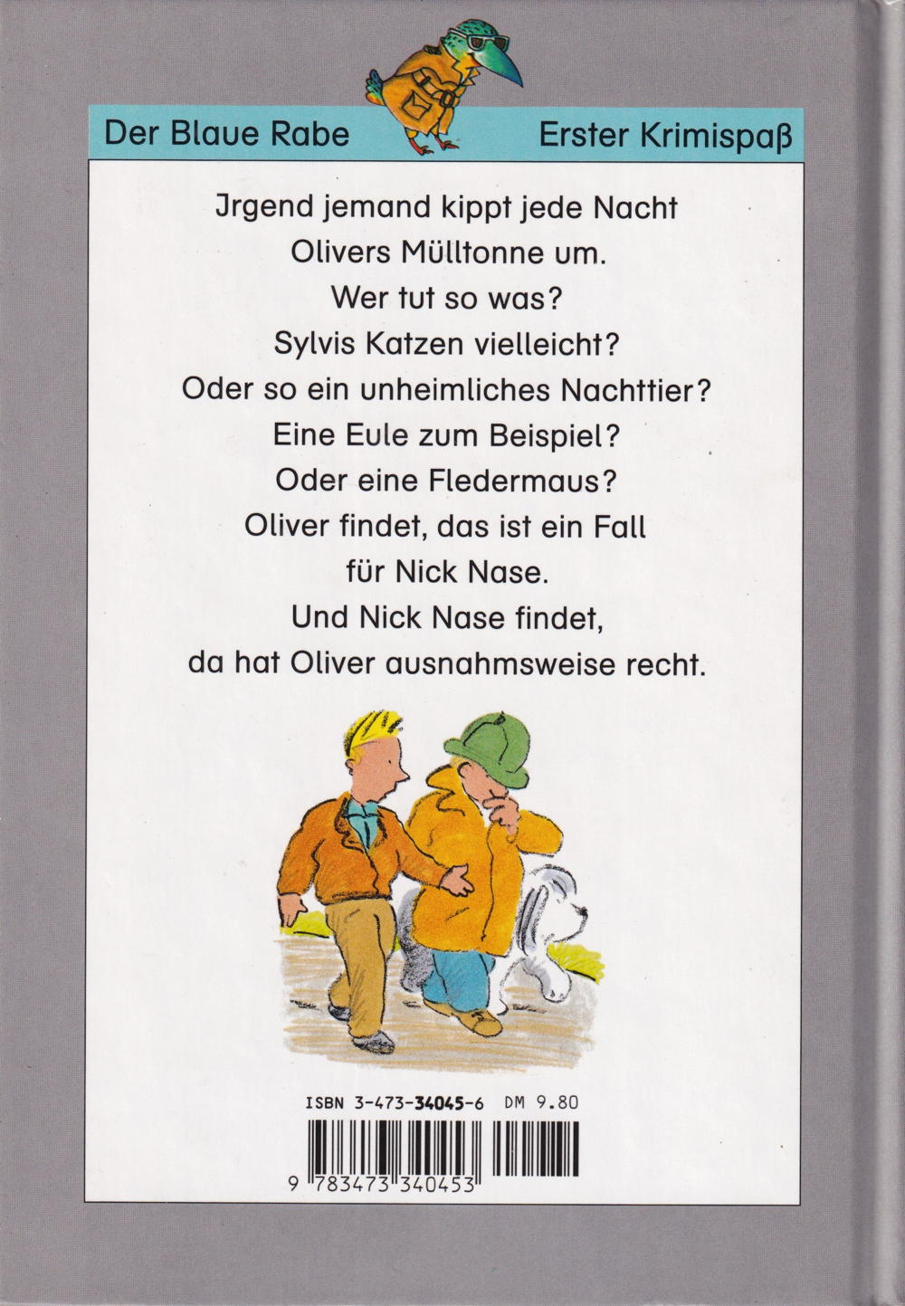 Irgend jemand kippt jede Nacht Olivers Mülltonne um. Wer tut so was? Sylvis Katzen vielleicht? Oder so ein unheimliches Nachttier? Eine Eule zum Beispiel? Oder eine Fledermaus? Oliver findet, das ist ein Fall für Nick Nase. Und Nick Nase findet, da hat Oliver ausnahmsweise recht.