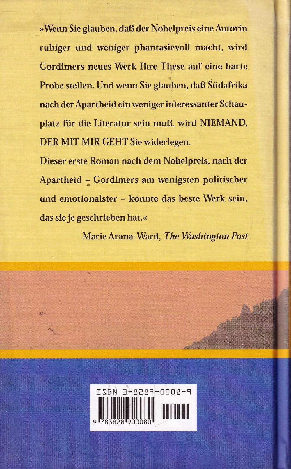 »Wenn Sie glauben, dass der Nobelpreis eine Autorin ruhiger und weniger phantasievoll macht, wird Gordimers neues Werk Ihre These auf eine harte Probe stellen. Und wenn Sie glauben, dass Südafrika nach der Apartheid ein weniger interessanter Schauplatz für die Literatur sein muss, wird NIEMAND, DER MIT MIR GEHT Sie widerlegen.