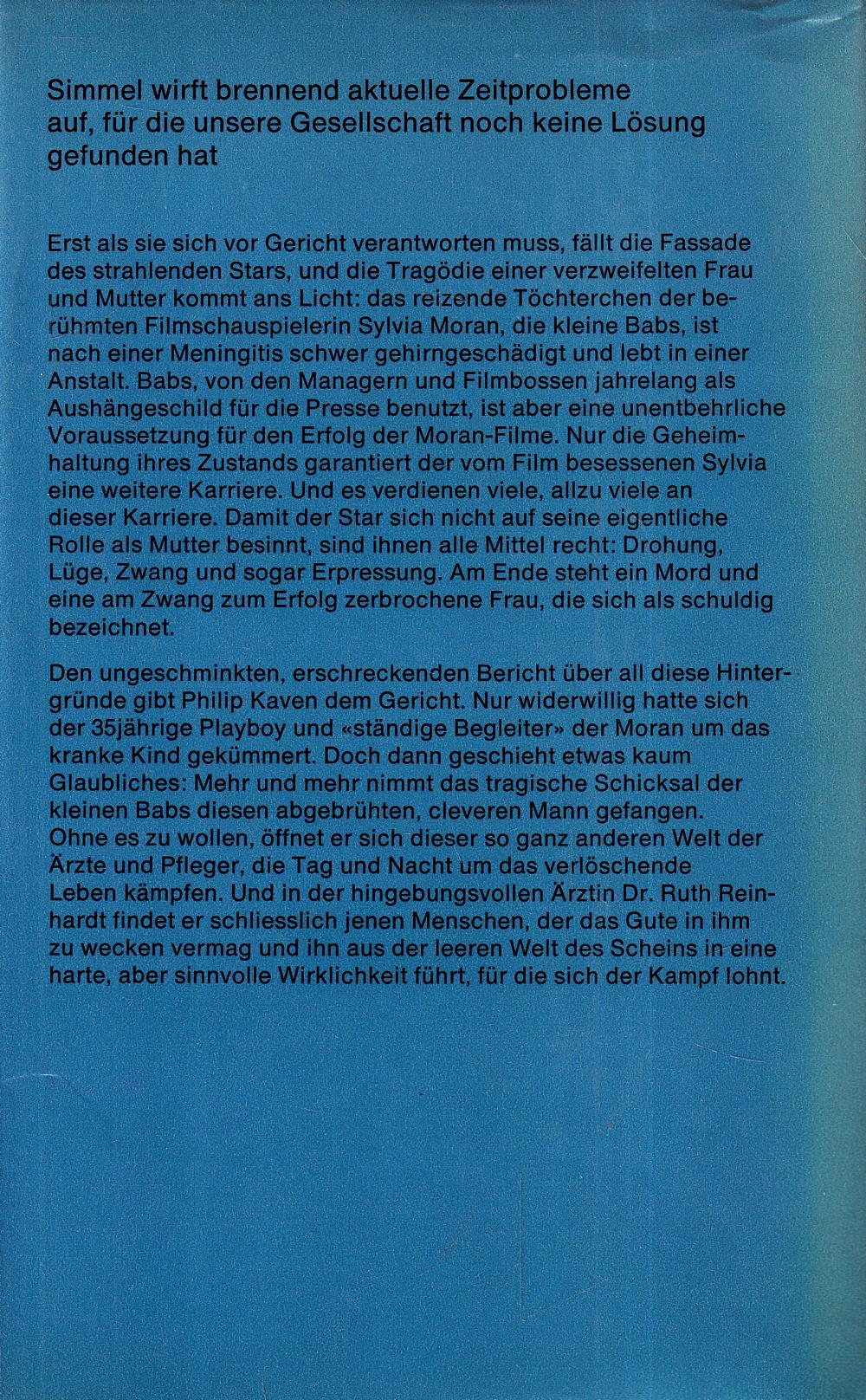 Simmel wirft brennend aktuelle Zeitprobleme auf, für die unsere Gesellschaft noch keine Lösung gefunden hat Erst als sie sich vor Gericht verantworten muss, fällt die Fassade des strahlenden Stars, und die Tragödie einer verzweifelten Frau und Mutter kommt ans Licht: das reizende Töchterchen der berühmten Filmschauspielerin Sylvia Moran, die kleine Babs, ist nach einer Meningitis schwer gehirngeschädigt und lebt in einer Anstalt. Babs, von den Managern und Filmbossen jahrelang als Aushängeschild für die Presse benutzt, ist aber eine unentbehrliche Voraussetzung für den Erfolg der Moran-Filme. Nur die Geheimhaltung ihres Zustands garantiert der vom Film besessenen Sylvia eine weitere Karriere. Und es verdienen viele, allzu viele an dieser Karriere. Damit der Star sich nicht auf seine eigentliche Rolle als Mutter besinnt, sind ihnen alle Mittel recht: Drohung, Lüge, Zwang und sogar Erpressung. Am Ende steht ein Mord und eine am Zwang zum Erfolg zerbrochene Frau, die sich als schuldig bezeichnet.