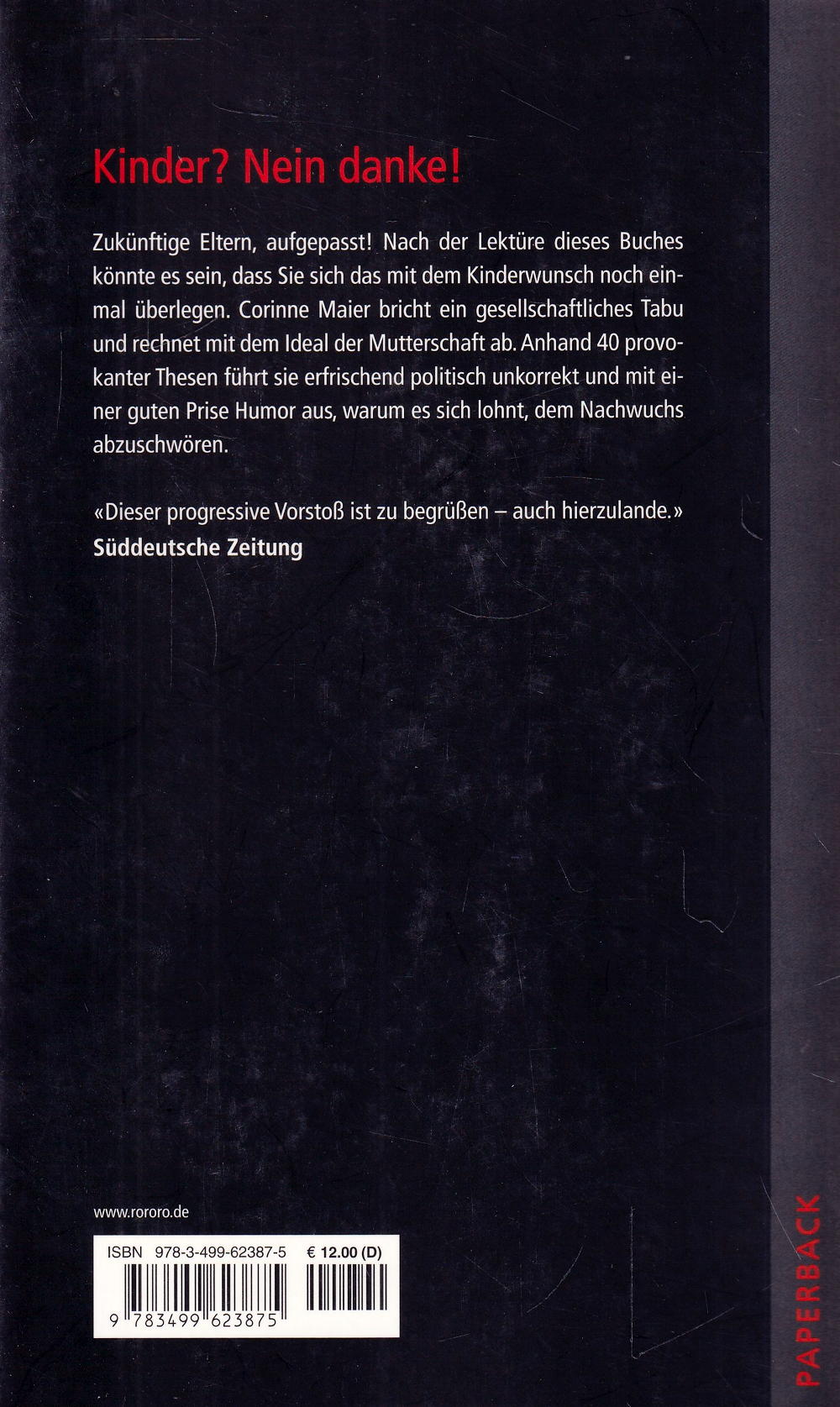 Zukünftige Eltern, aufgepasst! Nach der Lektüre dieses Buches könnte es sein, dass Sie sich das mit dem Kinderwunsch noch einmal überlegen. Corinne Maier bricht ein gesellschaftliches Tabu und rechnet mit dem Ideal der Mutterschaft ab. Anhand 40 provokanter Thesen führt sie erfrischend politisch unkorrekt und mit einer guten Prise Humor aus, warum es sich lohnt, dem Nachwuchs abzuschwören.