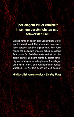 Dreissig Jahre ist es her, dass John Pullers Mutter spurlos verschwand. Der Fall wurde nie aufgeklärt. Doch nun tritt plötzlich eine frühere Freundin der Familie mit einer ungeheuerlichen Behauptung auf: Puller senior hätte damals seine eigene Frau ermordet. Tatsächlich zeigt sich, dass der Beschuldigte in der fraglichen Nacht nicht im Militäreinsatz war, wie stets behauptet, sondern heimlich nach Fort Monroe zurückgekommen ist. Fatal daran: Puller senior ist seit Längerem dement und kann nichts zu seiner Verteidigung vorbringen. Also liegt es an Spezialagent John Puller junior, den Familiennamen reinzuwaschen. Was er nicht weiss: Auf der anderen Seite der USA ist gerade ein Schwerverbrecher aus dem Gefängnis freigekommen. Auch ihn zieht es nach Fort Monroe – um finstere Rache zu nehmen für etwas, was ihm vor dreissig Jahren angetan wurde...