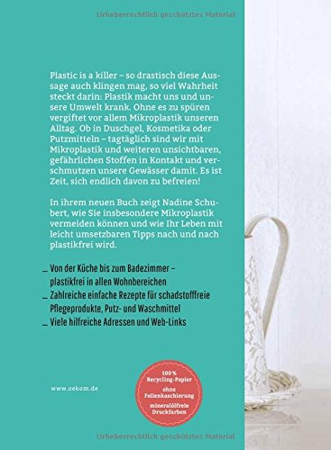 Plastic is a killer – so drastisch diese Aussage auch klingen mag, so viel Wahrheit steckt darin: Plastik macht uns und unsere Umwelt krank. Ohne es zu spüren vergiftet vor allem Mikroplastik unseren Alltag. Ob in Duschgel, Kosmetika oder Putzmitteln – tagtäglich sind wir mit Mikroplastik und weiteren unsichtbaren, gefährlichen Stoffen in Kontakt und verschmutzen unsere Gewässer damit. Es ist Zeit, sich endlich davon zu befreien! In ihrem neuen Buch zeigt Nadine Schubert, wie Sie insbesondere Mikroplastik vermeiden können und wie Ihr Leben mit leicht umsetzbaren Tipps nach und nach plastikfrei wird. - Von der Küche bis zum Badezimmer – plastikfrei in allen Wohnbereichen - Zahlreiche einfache Rezepte für schadstofffreie Pflegeprodukte, Putz- und Waschmittel - Viele hilfreiche Adressen und Web-Links