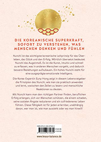 Die koreanische Lebenskunst für ein gelingendes Miteinander. Nunchi ist die Superpower des koreanischen Lebens und gilt als unabdingbar für das Überleben, das Glück und den Erfolg. Wörtlich übersetzt bedeutet Nunchi [nun tschi] das Augenmass. Es ist die Kunst, sofort zu erfassen, was andere Menschen denken und fühlen, und dadurch die Beziehungen zu verbessern. Man kann es auch die emotionale Intelligenz im koreanischen Stil nennen.Die Korea-Expertin Euny Hong zeigt in diesem Lebensratgeber die Prinzipien des Nunchi, wie man sie praktisch anwendet und lernt, "zwischen den Zeilen zu lesen" und menschliche Reaktionen zu deuten.Mit Nunchi kann man den richtigen Partner im Leben finden, beruflichen Erfolg erlangen, sich vor Menschen schützen, die einem Schaden zufügen, seine sozialen Ängste reduzieren und ein zufriedeneres Leben führen. Diese Fähigkeit ist für jeden erlernbar, unabhängig davon, wer man ist, wo man steht, wie man aussieht, oder wo man hinwill. Die wichtigste Technik dabei ist, zu beobachten.Die acht Prinzipien des Nunchi:1. Legen Sie Ihre Vorurteile ab.2. Der Nunchi-Beobachter-Effekt: Lernen Sie zu beobachten.3. Beobachten Sie, um Informationen zu erhalten.4. Verpassen Sie niemals die Gelegenheit, den Mund zu halten.5. Halten Sie sich an die Regeln.6. Lesen Sie zwischen den Zeilen. Die Leute sagen nicht immer, was sie denken.7. Wenn Sie unbeabsichtigt Schaden anrichten, ist das manchmal so schlimm, als hätten Sie es absichtlich getan.8. Seien Sie flink und schnell.