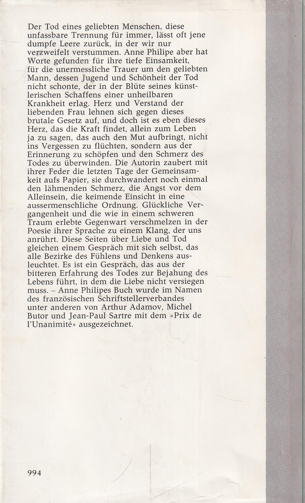 Der Tod eines geliebten Menschen, diese unfassbare Trennung für immer, lässt oft jene dumpfe Leere zurück, in der wir nur verzweifelt verstummen. Anne Philipe aber hat Worte gefunden für ihre tiefe Einsamkeit, für die unermessliche Trauer um den geliebten Mann, dessen Jugend und Schönheit der Tod nicht schonte, der in der Blüte seines künstlerischen Schaffens einer unheilbaren Krankheit erlag. Herz und Verstand der liebenden Frau lehnen sich gegen dieses brutale Gesetz auf, und doch ist es eben dieses Herz, das die Kraft findet, allein zum Leben ja zu sagen, das auch den Mut aufbringt, nicht ins Vergessen zu flüchten, sondern aus der Erinnerung zu schöpfen und den Schmerz des Todes zu überwinden. Die Autorin zaubert mit ihrer Feder die letzten Tage der Gemeinsamkeit aufs Papier, sie durchwandert noch einmal den lähmenden Schmerz, die Angst vor dem Alleinsein, die keimende Einsicht in eine aussermenschliche Ordnung. Glückliche Vergangenheit und die wie in einem schweren Traum erlebte Gegenwart verschmelzen in der Poesie ihrer Sprache zu einem Klang, der uns anrührt. Diese Seiten über Liebe und Tod gleichen einem Gespräch mit sich selbst, das alle Bezirke des Fühlens und Denkens ausleuchtet. Es ist ein Gespräch, das aus der bitteren Erfahrung des Todes zur Bejahung des Lebens führt, in dem die Liebe nicht versiegen muss. - Anne Philipes Buch wurde im Namen des französischen Schriftstellerverbandes unter anderen von Arthur Adamov, Michel Butor und Jean-Paul Sartre mit dem «Prix de l'Unanimité» ausgezeichnet.