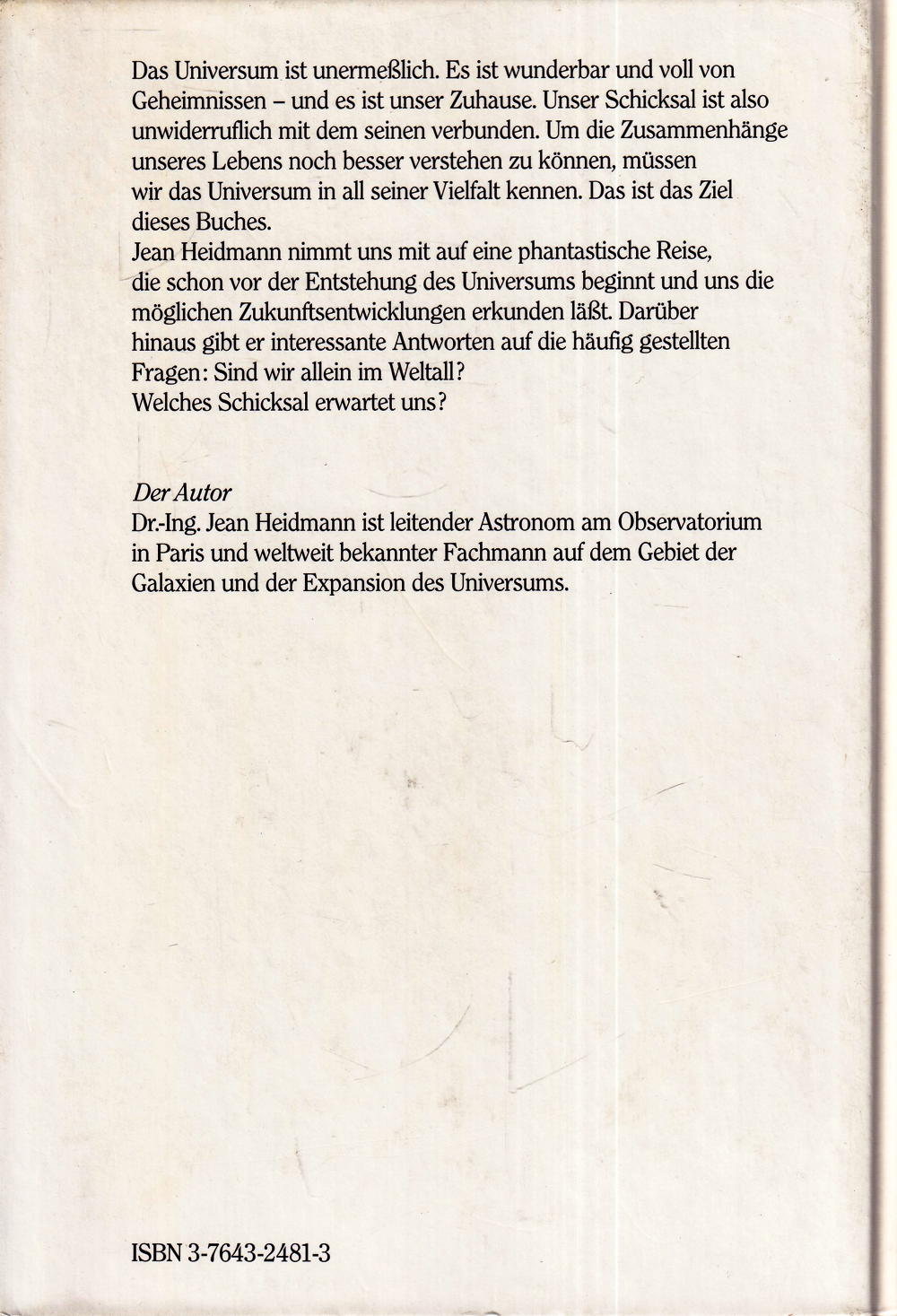 Der Autor Dr-Ing. Jean Heidmann ist leitender Astronom am Observatorium in Paris und weltweit bekannter Fachmann auf dem Gebiet der Galaxien und der Expansion des Universums.