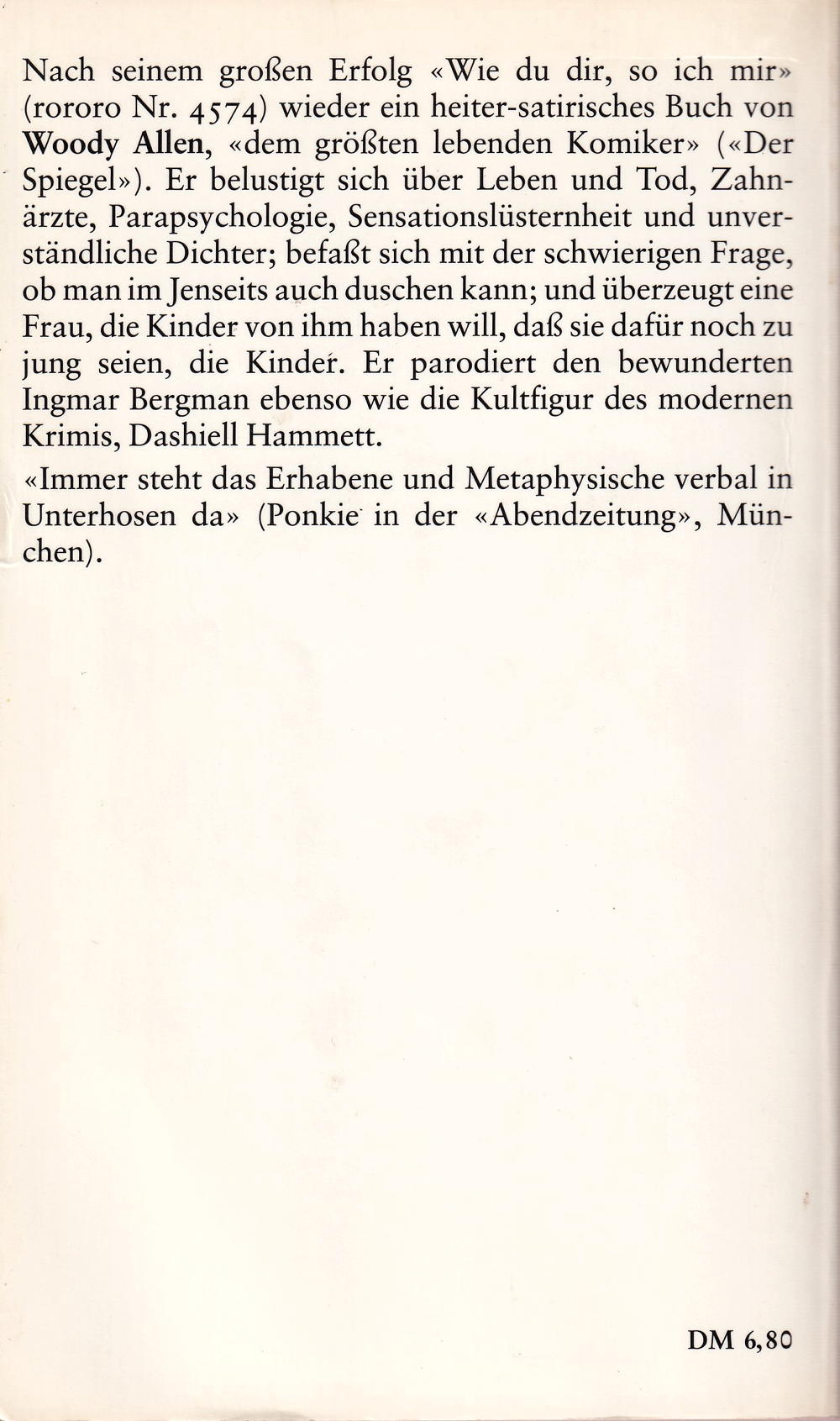 Nach seinem grossen Erfolg "Wie du dir, so ich mir" wieder ein heiter-satirisches Buch Woody Allen, «dem grössten lebenden Komiker» («Der Spiegel»). Er belustigt sich über Leben und Tod, Zahnärzte, Parapsychologie, Sensationslüsternheit und unverständliche Dichter; befasst sich mit der schwierigen Frage, ob man im Jenseits auch duschen kann; und überzeugt eine Frau, die Kinder von ihm haben will, dass sie dafür noch zu jung seien, die Kinder. Er parodiert den bewunderten Ingmar Bergman ebenso wie die Kultfigur des modernen Krimis, Dashiell Hammett.