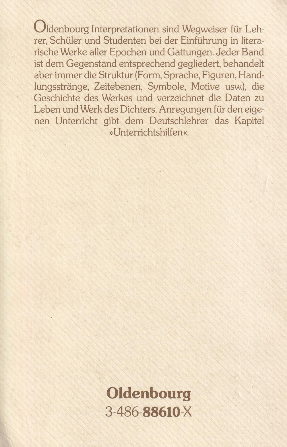 Oldenbourg Interpretationen sind Wegweiser für Lehrer, Schüler und Studenten bei der Einführung in literarische Werke aller Epochen und Gattungen. Jeder Band ist dem Gegenstand entsprechend gegliedert, behandelt aber immer die Struktur (Form, Sprache, Figuren, Handlungsstränge, Zeitebenen, Symbole, Motive usw.), die Geschichte des Werkes und verzeichnet die Daten zu Leben und Werk des Dichters. Anregungen für den eigenen Unterricht gibt dem Deutschlehrer das Kapitel »Unterrichtshilfen«.