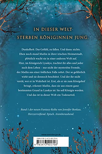 In dieser Welt sterben Königinnen jung. Dunkelheit. Das Gefühl, zu fallen. Und dann: nichts. Eben noch stand Mailin in ihrer irischen Heimatstadt, plötzlich wacht sie in einer anderen Welt auf. Hier, im Königreich Lyaskye, trachtet ihr alles und jeder nach dem Leben – nur nicht der mysteriöse Fremde, der Mailin aus einer tödlichen Falle rettet. Der so gefährlich wirkt und sie dennoch beschützt. Und der ihr nicht verrät, wer er in Wahrheit ist. Erst, als er sie zum Königshof bringt, erkennt Mailin, dass sie aus einem ganz bestimmten Grund in Lyaskye ist: Sie soll Königin werden. Und das ist in dieser Welt ein Todesurteil. Band 1 der High-Romantasy-Reihe von SPIEGEL-Bestsellerautorin Jennifer Benkau