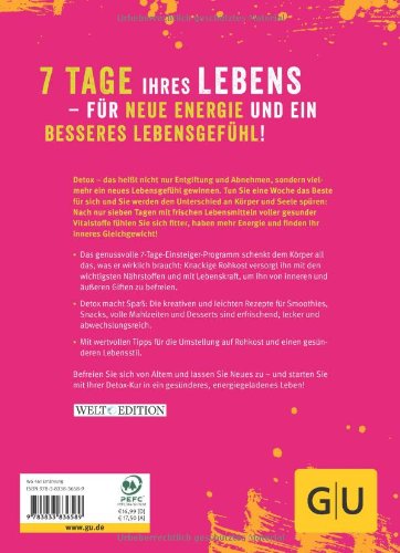 Erica Palmcrantz' leicht umzusetzendes 7-Tage-Detox-Programm ist nicht nur ein Entgiftungsplan mit dem Besten aus der Natur, sondern wirkt sich vielmehr positiv auf das gesamte Lebensgefühl aus: vegane Ernährung und Rohkost machen fitter, sie erhöhen den eigenen Energielevel und sorgen für ein inneres Gleichgewicht. Die Ernährungsexpertin zeigt, wie die verschiedensten Gifte wie minderwertige Lebensmittel oder Abgase und Nikotin unseren Körper in allen Lebenslagen beeinträchtigen und zu Müdigkeit, Gelenkschmerzen bis hin zu Niedergeschlagenheit und anderen Verstimmungen führen können. Ihr Detox-Programm gibt dem Körper all das, was er wirklich braucht und zeigt: Detox kann Spass machen, denn die zahlreichen kreativen und leichten Rezepte für Smoothies, Snacks und volle Mahlzeiten sind nicht nur gesund, sondern auch noch lecker und eine erfrischende Abwechslung. Detox wird zu einem Lebensgefühl, einer inneren Haltung, nämlich gut zu sich selbst zu sein und das Beste für sich zu tun.