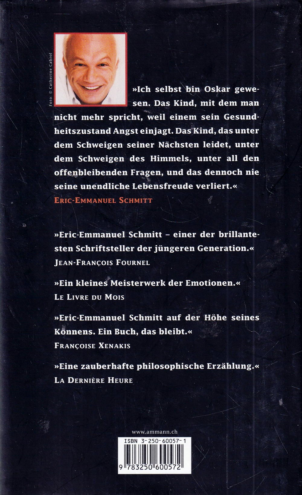 "Ich selbst bin Oskar gewesen. Das Kind, mit dem man nicht mehr spricht, weil einem sein Gesundheitszustand Angst einjagt. Das Kind, das unter dem Schweigen seiner Nächsten leidet, unter dem Schweigen des Himmels, unter all den offen bleibenden Fragen, und das dennoch nie seine unendliche Lebensfreude verliert."
