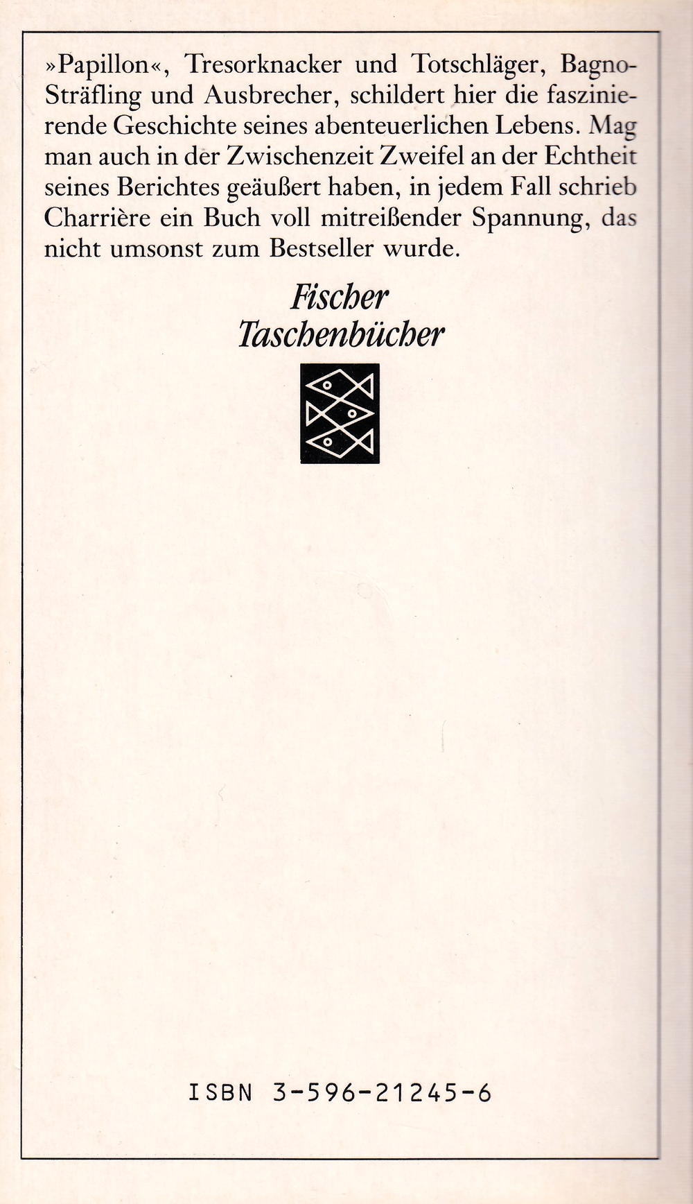 Dieser Bestseller machte seinen Autor zum mehrfachen Tantieme-Millionär. Der ehemalige Tresorknacker und spätere Bagno-Sträfling, Ausbrecher und Totschläger schildert hier die Geschichte seines wüsten, abenteuerlichen Heldenlebens. Mag man auch in der Zwischenzeit versucht haben, ihm den Ruhm, dieses Leben selber geführt zu haben, streitig zu machen, ihn einen erfindungsreichen Aufschneider genannt haben, "Papillon" bleibt ein faszinierender Erzähler.