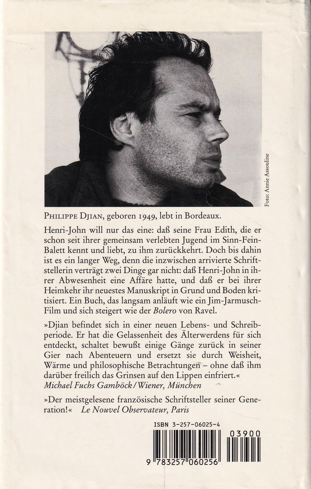 Henri-John will nur das eine: dass seine Frau Edith, die er schon seit ihrer gemeinsam verlebten Jugend im Sinn-Fein-Balett kennt und liebt, zu ihm zurückkehrt. Doch bis dahin ist es ein langer Weg, denn die inzwischen arrivierte Schriftstellerin verträgt zwei Dinge gar nicht: dass Henri-John in ihrer Abwesenheit eine Affäre hatte, und dass er bei ihrer Heimkehr ihr neuestes Manuskript in Grund und Boden kritisiert. Ein Buch, das langsam anläuft wie ein Jim-Jarmusch-Film und sich steigert wie der Bolero von Ravel.