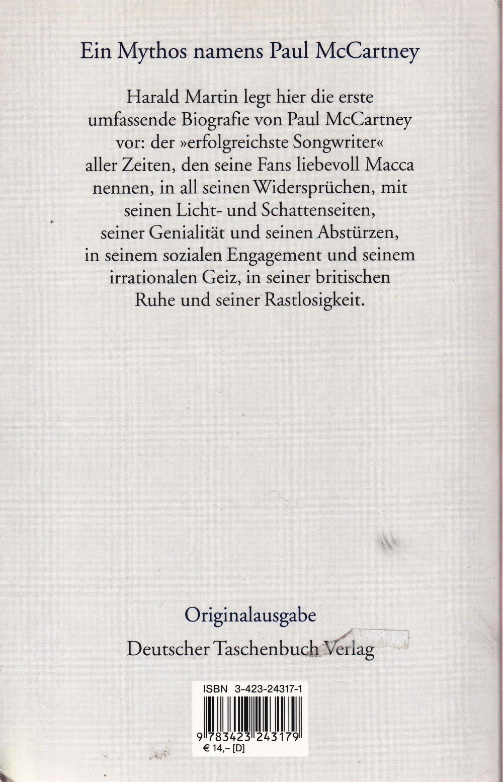 Harald Martin, mehrfach ausgezeichneter Rundfunkjournalist und Beatles-Kenner, begnügt sich in dieser Biographie anlässlich des 60. Geburtstags von Paul McCartney nicht mit dem weitverbreiteten Bild von Everbody's Darling Paul. Nicht als Hofberichterstatter, sondern mit kritischem Blick zeichnet Harald Martin das differenzierte, aber auch humorvolle Porträt eines begnadeten Musikers und einer widersprüchlichen Persönlichkeit. Es ist das Bild eines aufregenden Lebens und eines facettenreichen Menschen. Am 18.Juni 1942 in Liverpool in kleinbürgerlichen Verhältnissen geboren, erfuhr derselbe Mann 55 Jahre später, am 11.März 1997, die höchste Ehre, die einem Bürgerlichen im Vereinigten Königreich zuteil werden kann: Er wurde mit 'Sir Paul' zum Ritter geschlagen. Wir lesen über einen Menschen, der schwankt zwischem sozialem Engagement und irrationalem Ehrgeiz, zwischen britisch-zurückhaltender Ruhe und extrovertierter Rastlosigkeit, zwischen freundlicher Lässigkeit und Kontrollsucht. Das Buch begleitet Paul McCartney durch die Höhen und Tiefen seines Musikerlebens, von jener Zeit, in der der Beatles-Mythos geboren wurde, über die - was Erfolg und Qualität betrifft - heterogene Solokarriere des genialen Songwriters mit Hang zur Süssware bis hin zur zweiten Karriere als Maler und dem zweiten Frühling an der Seite von Heather Mills (die Hochzeit soll für 2002 geplant sein.) Bei seinen Recherchen für dieses lebendige Porträt konnte sich der Autor auch auf Gespräche mit Personen stützen, die lange mit Paul McCartney zusammengearbeitet haben, wie zum Beispiel dem Siegener Ausstellungsmacher Wolfgang Suttner, der McCartneys Bilder weltweit erstmals präsentierte, oder dem Musiker und Künstler Klaus Voormann.