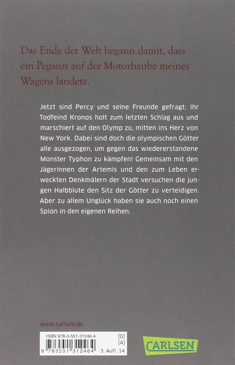 Auf Percy Jackson und seine Freunde wartet ein heißer Tanz: Ihr Todfeind Kronos holt zum letzten Schlag aus und marschiert auf den Olymp zu, mitten ins Herz von New York. Dabei sind die olympischen Götter alle ausgezogen, um gegen das Monster Typhon zu kämpfen! Gemeinsam mit den Jägerinnen der Artemis und den zum Leben erweckten Denkmälern der Stadt versuchen die jungen Halbblute den Sitz der Götter zu verteidigen. Doch sie haben einen Verräter in den eigenen Reihen.