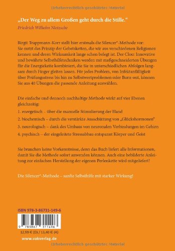 Birgit Trappmann-Korr stellt die neu konzipierte Silencer®-Methode vor, die bewährte Übungen aus verschiedenen Bereichen (HerzIntelligenz®, Quantenhei lung, EMDR usw.) mit einem Perlenband kombiniert, das der Anwender in unterschiedlichen Abfolgen langsam durch die Finger gleiten lässt. Diese nachhaltige Methode wirkt auf vier Ebenen gleichzeitig: