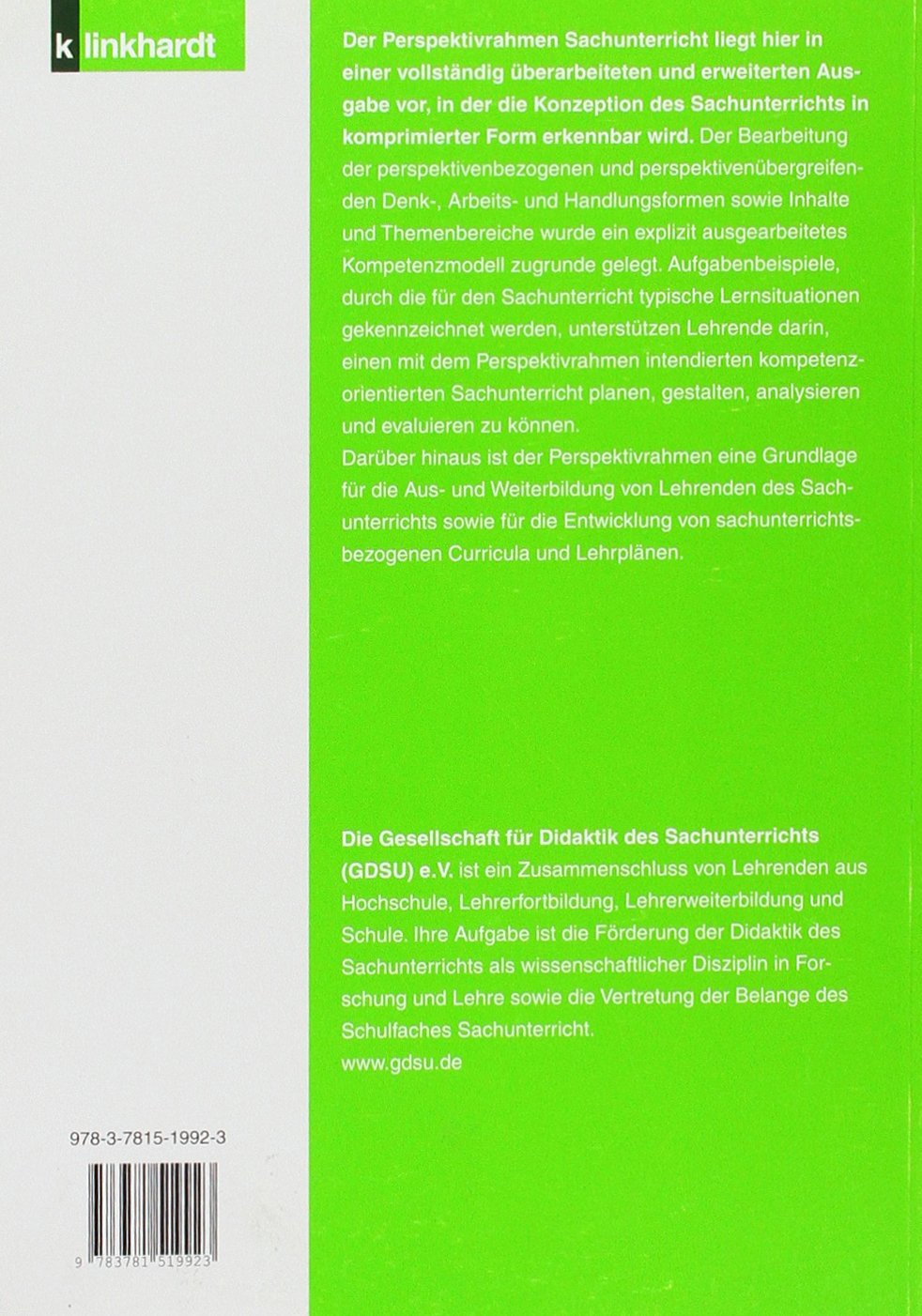 Der Perspektivrahmen Sachunterricht liegt hier in einer vollständig überarbeiteten und erweiterten Ausgabe vor, in der die Konzeption des Sachunterrichts in komprimierter Form erkennbar wird. Der Bearbeitung der perspektivenbezogenen und perspektivenübergreifenden Denk-, Arbeits- und Handlungsformen sowie Inhalte und Themenbereiche wurde ein explizit ausgearbeitetes Kompetenzmodell zugrunde gelegt. Aufgabenbeispiele, durch die für den Sachunterricht typische Lernsituationen gekennzeichnet werden, unterstützen Lehrende darin, einen mit dem Perspektivrahmen intendierten kompetenzorientierten Sachunterricht planen, gestalten, analysieren und evaluieren zu können. Darüber hinaus ist der Perspektivrahmen eine Grundlage für die Aus- und Weiterbildung von Lehrenden des Sachunterrichts sowie für die Entwicklung von sachunterrichtsbezogenen Curricula und Lehrplänen.