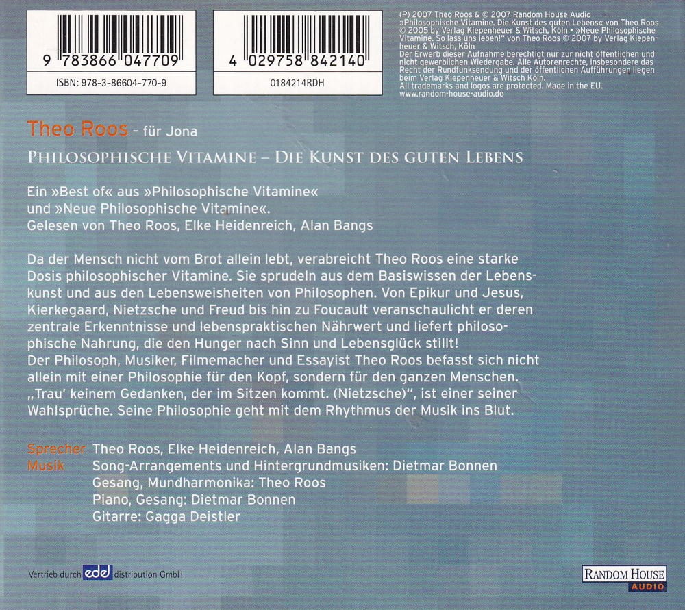 Da der Mensch nicht vom Brot allein lebt, verabreicht Theo Roos eine starke Dosis philosophischer Vitamine. Sie sprudeln aus dem Basiswissen der Lebenskunst und aus den Lebensweisheiten von Philosophen. Von Epikur und Jesus, Kierkegaard, Nietzsche und Freud bis hin zu Foucault veranschaulicht er deren zentrale Erkenntnisse und lebenspraktischen Nährwert und liefert philosophische Nahrung, die den Hunger nach Sinn und Lebensglück stillt! Der Philosoph, Musiker, Filmemacher und Essayist Theo Roos befasst sich nicht allein mit einer Philosophie für den Kopf, sondern für den ganzen Menschen. „Trau' keinem Gedanken, der im Sitzen kommt. (Nietzsche) ", ist einer seiner Wahlsprüche. Seine Philosophie geht mit dem Rhythmus der Musik ins Blut.
