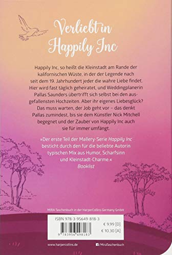 Happily Inc, so heisst die Kleinstadt am Rande der kalifornischen Wüste, in der der Legende nach seit dem 19. Jahrhundert jeder die wahre Liebe findet. Hier wird fast täglich geheiratet, und Weddingplanerin Pallas Saunders übertrifft sich selbst bei den ausgefallensten Hochzeiten. Aber ihr eigenes Liebesglück? Das muss warten, der Job geht vor - das denkt Pallas zumindest, bis sie dem Künstler Nick Mitchell begegnet und der Zauber von Happily Inc auch sie für immer umfängt. »Mallery übertrifft sich selbst mit diesen Protagonisten, die auf dem Weg zum Happy End sowohl für sich gesehen als auch gemeinsam wachsen. « Publishers Weekly »Der erste Teil der Mallery-Serie Happily Inc besticht durch den für die beliebte Autorin typischen Mix aus Humor, Scharfsinn und Kleinstadt-Charme. « Booklist »Die Liebesgeschichte ist süss und sexy, der Stil schnell und leicht … Eine tolle Wochenendlektüre!« Kirkus Reviews »Eine Fülle an tragenden Figuren - Nicks Künstler-Brüder bleiben im Gedächtnis - verleihen dem Plot noch mehr Tiefe, während lebendige Beschreibungen der sehr kreativen Hochzeitspläne und -orte faszinieren … Eine einfallsreiche Heldin, die ihre Berufung findet, und ein fürsorglicher Held, der herausfindet, worauf es ankommt, geben sich in dieser unbeschwerten Geschichte der Liebe hin.