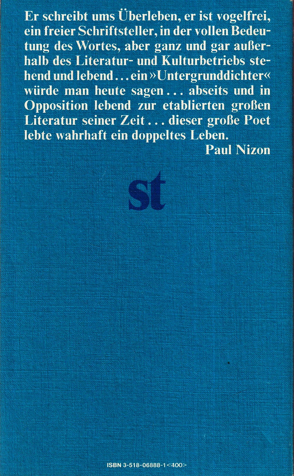 Er schreibt ums Überleben, er ist vogelfrei, ein freier Schriftsteller, in der vollen Bedeutung des Wortes, aber ganz und gar ausserhalb des Literatur- und Kulturbetriebs stehend und lebend... Ein»Untergrunddichter« würde man heute sagen... Abseits und in Opposition lebend zur etablierten grossen Literatur seiner Zeit... Dieser grosse Poet lebte wahrhaft ein doppeltes Leben.