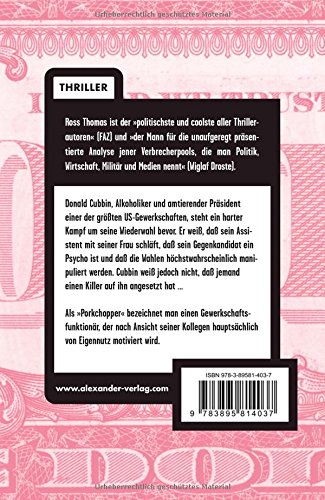 Ross Thomas (1926 - 1995) war ein amerikanischer Autor und Journalist. In den fünfziger JAhren richtete er das deutsche AFN-Büro in Bonn ein und arbeitete als Journalist, Gewerkschaftssprecher und Public Relations- und Wahlkampfberater für Politiker in den USA. Seine vielfältigen Erfahrungen verarbeitete er in seinen Politthrillern, in denen er v.a. die Hintergründe des (amerikanischen) Politikbetriebs entlarvt und blossstellt. Ihm wurde zweimal der Edgar Allen Poe Award und mehrmals der Deutsche Krimi Preis verliehen.