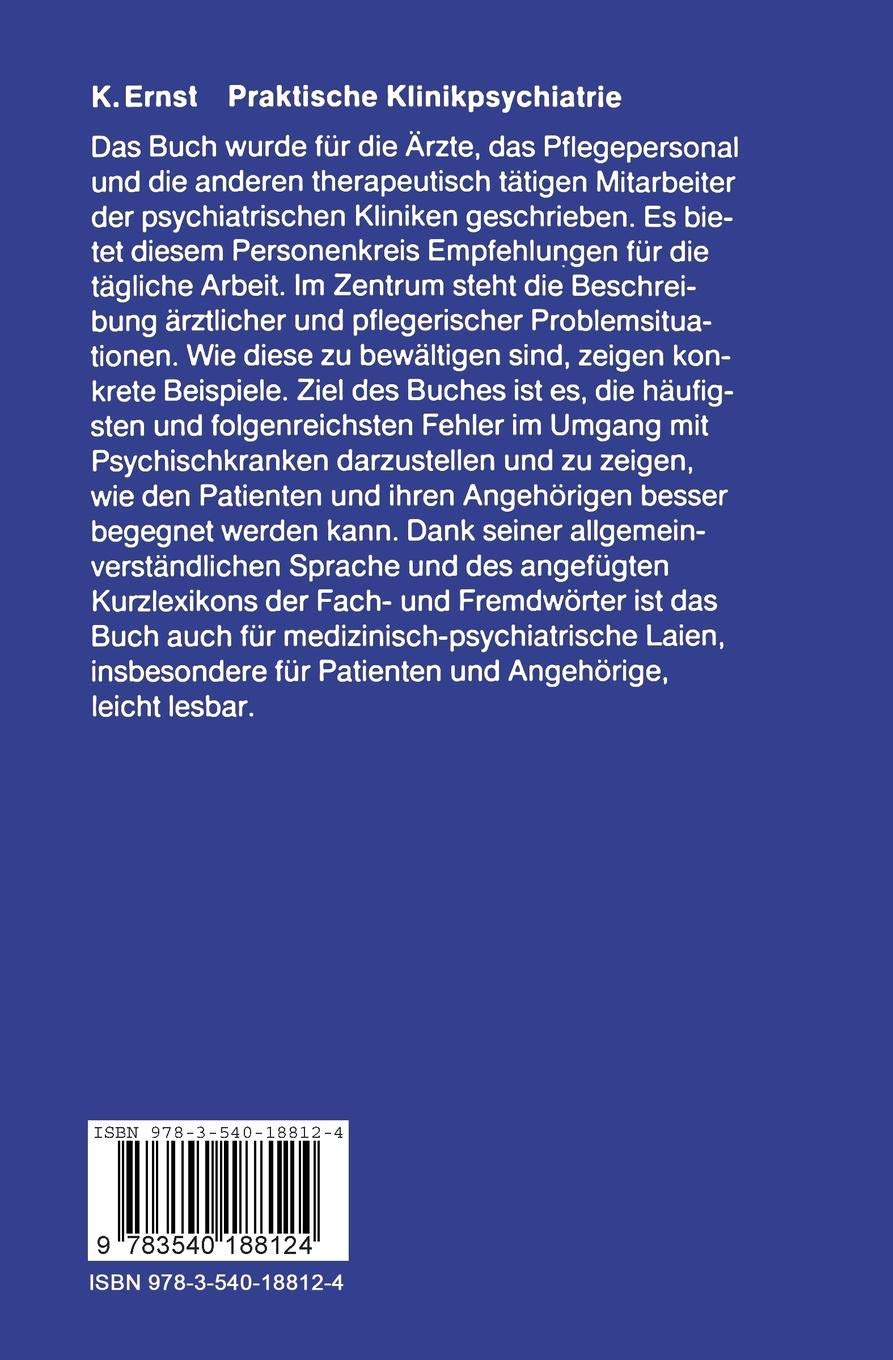 Die 2., neu bearbeitete und erweiterte Auflage dieses Buches wurde für die Ärzte, das Pflegepersonal und alle therapeutisch tätigen Mitarbeiter der psychiatrischen Kliniken geschrieben. Sie bietet diesem Personenkreis Empfehlungen für die tägliche Arbeit. Im Zentrum steht die Beschreibung ärztlicher und pflegerischer Problemsituationen. Wie diese zu bewältigen sind, zeigen konkrete Beispiele. Ziel des Buches ist es, die häufigsten und folgenreichsten Fehler im Umgang mit Psychischkranken darzustellen und zu zeigen, wie den Patienten und ihren Angehörigen besser begegnet werden kann. Dank seiner allgemeinverständlichen Sprache und des angefügten Kurzlexikons der Fach- und Fremdwörter ist das Buch auch für medizinisch-psychiatrische Laien, insbesondere für Patienten und Angehörige, leicht lesbar. Aus den Besprechungen zur 1. Auflage:"Das Buch von Professor Dr. K. Ernst kann für den Psychiatrie-Unterricht und für Stationsbesprechungen sehr empfohlen werden.