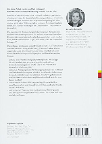 Wie kann Arbeit zur Gesundheit beitragen?Betriebliche Gesundheitsförderung rechnet sich für alle!Erweitert ein Unternehmen seine Personal- und Organisationsentwicklung im Sinne der Gesundheitsförderung, so können erwünschte Nebenwirkungen auftreten: Gesteigerte Leistungsfähigkeit, eine erhöhte Motivation, Wohlempfinden, geringere Arbeitsunfähigkeitszeiten, eine stärkere Bindung an das Unternehmen – und natürlich Gesundheit!Die Autorin stellt ihre jahrelangen Erfahrungen als Beraterin zahlreicher Unternehmen praxisnah dar und motiviert zum Umdenken. Denn statt immer wieder zu beschreiben, dass Arbeit krank machen kann, lautet die sinnvollere Frage: „Wie kann Arbeit zur Gesundheit beitragen?“Dieser Praxis-Guide zeigt anhand vieler Beispiele, dass Massnahmen der Personalentwicklung wie Führung, Kommunikation, Arbeitsorganisation und Arbeitstechniken im Sinne einer betrieblichen Gesundheitsförderung nachhaltig ergänzt und bereichert werden können.