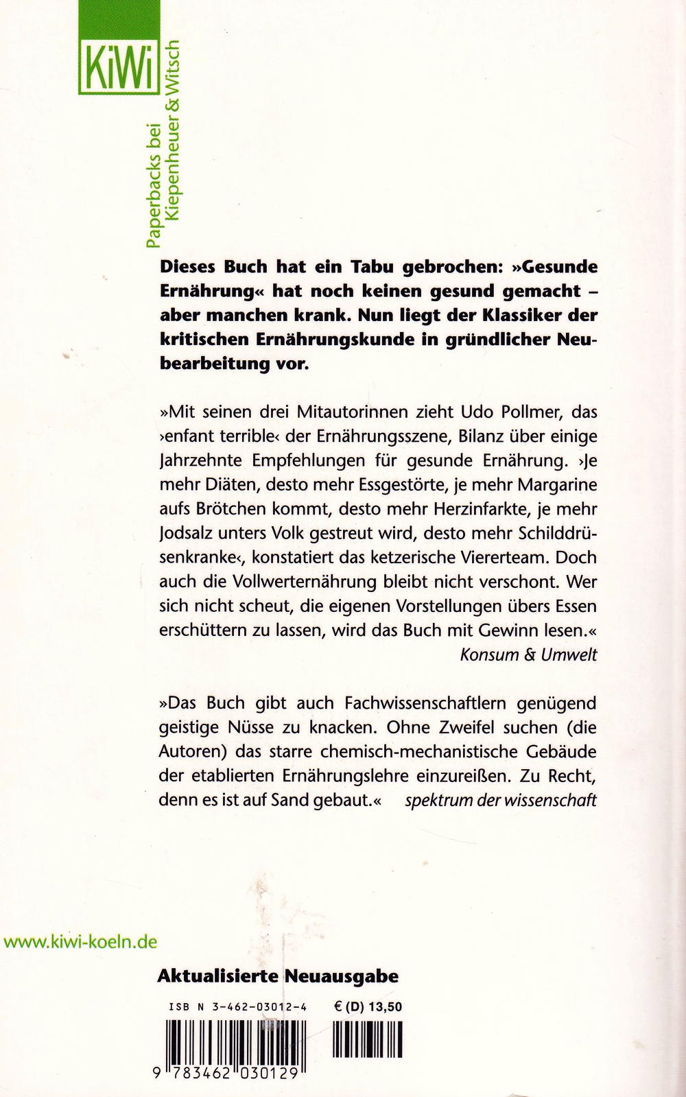 »Mit seinen drei Mitautorinnen zieht Udo Pollmer, das > enfant terrible« der Ernährungsszene, Bilanz über einige Jahrzehnte Empfehlungen für gesunde Ernährung. »Je mehr Diäten, desto mehr Essgestörte, je mehr Margarine aufs Brötchen kommt, desto mehr Herzinfarkte, je mehr Jodsalz unters Volk gestreut wird, desto mehr Schilddrüsenkranke«, konstatiert das ketzerische Viererteam. Doch auch die Vollwerternährung bleibt nicht verschont. Wer sich nicht scheut, die eigenen Vorstellungen übers Essen erschüttern zu lassen, wird das Buch mit Gewinn lesen.