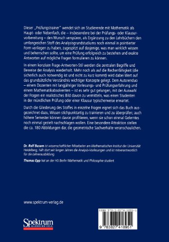 Dieser „Prüfungstrainer“ wendet sich an Studierende mit Mathematik als Haupt- oder Nebenfach, die – insbesondere bei der Prüfungs- oder Klausurvorbereitung – den Wunsch verspüren, als Ergänzung zu den Lehrbüchern den umfangreichen Stoff des Analysisgrundstudiums noch einmal in pointierter Form vorliegen zu haben, zugespitzt auf dasjenige, was man wirklich wissen und beherrschen sollte, um eine Prüfung erfolgreich zu bestehen und exakte Antworten auf mögliche Fragen formulieren zu können. In einem konzisen Frage-Antworten-Stil werden die zentralen Begriffe und Beweise der Analysis wiederholt. Mehr noch als auf die Rechenfähigkeit (die sicherlich auch notwendig ist und nicht zu kurz kommt) wird dabei Wert auf das grundsätzliche Verständnis wichtiger Konzepte gelegt. Dem Autorenduo – einem Dozenten mit langjähriger Vorlesungs- und Prüfungserfahrung und einem Mathematikabsolventen – ist es sehr gut gelungen, mit der Auswahl der Fragen ein realistisches Bild davon zu vermitteln, was einen Studenten in der mündlichen Prüfung oder einer Klausur typischerweise erwartet. Durch die Gliederung des Stoffes in einzelne Fragen eignet sich das Buch ausgezeichnet dazu, Wissen stichpunktartig zu trainieren und zu überprüfen; auch höhere Semester können davon profitieren, wenn sie schon einmal Gelerntes noch einmal gezielt nachschlagen wollen. Eine besondere Attraktion stellen die ca. 180 Abbildungen dar, die geometrische Sachverhalte veranschaulichen.
