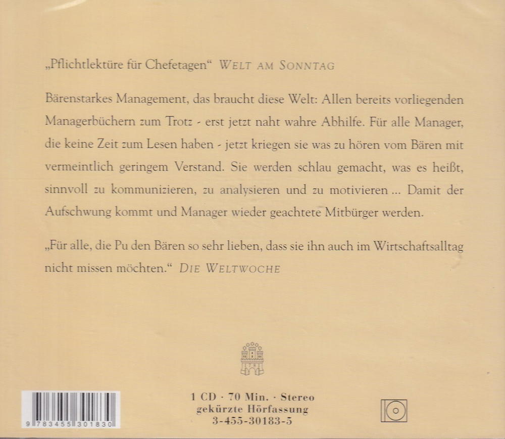 Bärenstarkes Management, das braucht diese Welt: Allen bereits vorliegenden Managerbüchern zum Trotz - erst jetzt naht wahre Abhilfe. Für alle Manager, die keine Zeit zum Lesen haben - jetzt kriegen sie was zu hören vom Bären mit vermeintlich geringem Verstand. Sie werden schlau gemacht, was es heisst, sinnvoll zu kommunizieren, zu analysieren und zu motivieren.. Damit der Aufschwung kommt und Manager wieder geachtete Mitbürger werden.